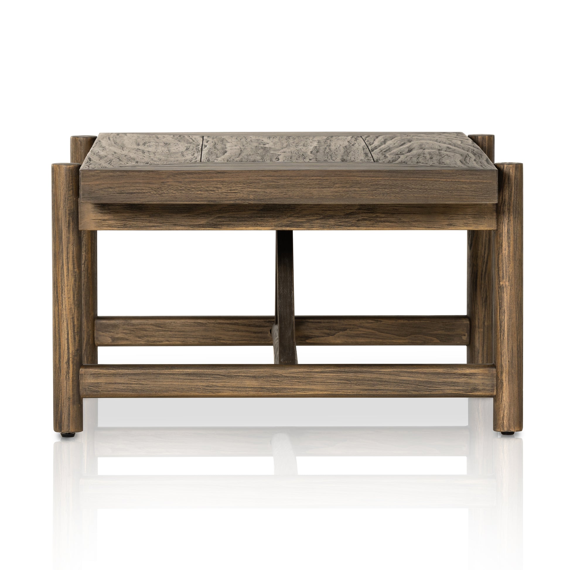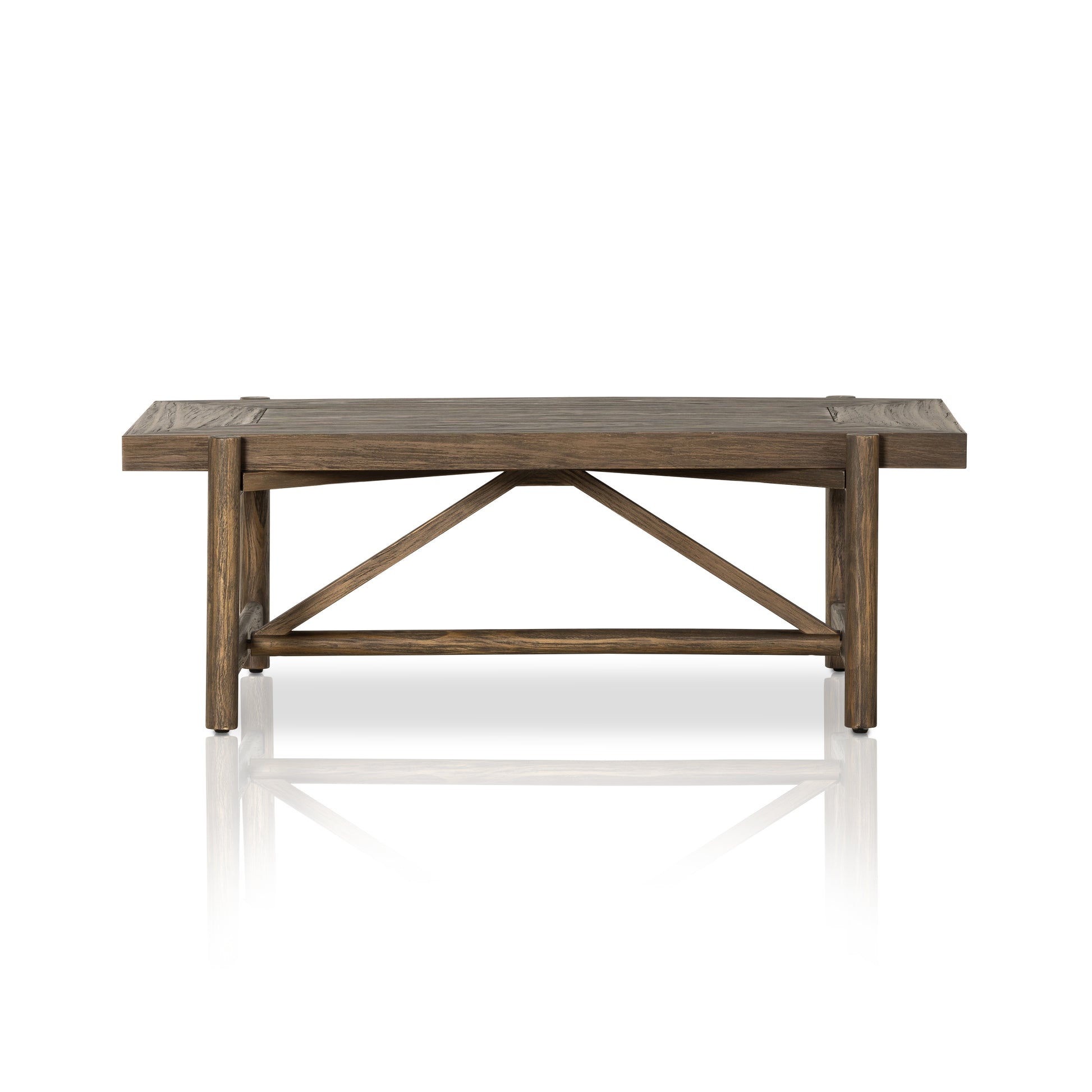 Hardworking industrial furniture inspired the hefty proportions of this solid wood coffee table. Structured, clean lines with exposed metal hardware add warm contrast.