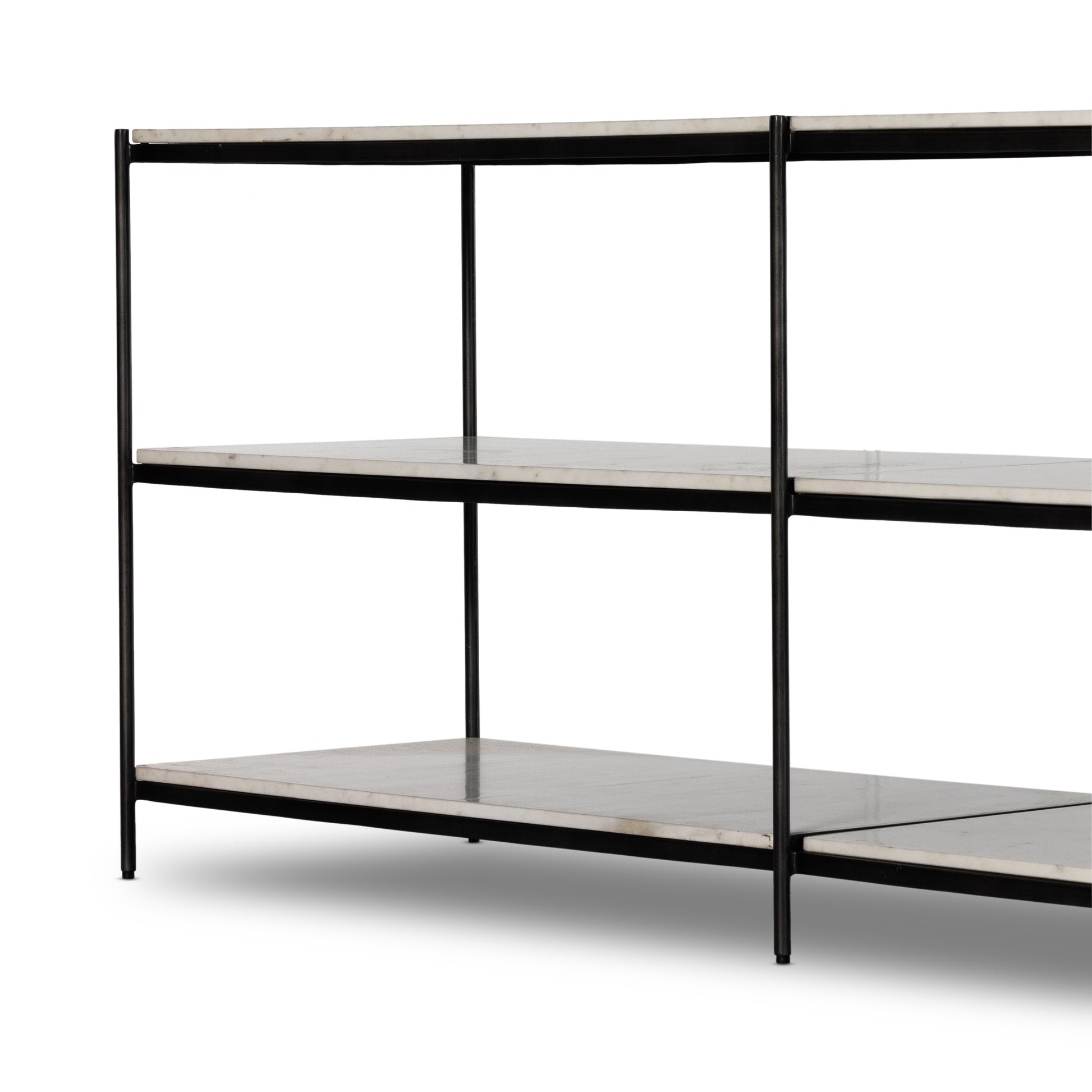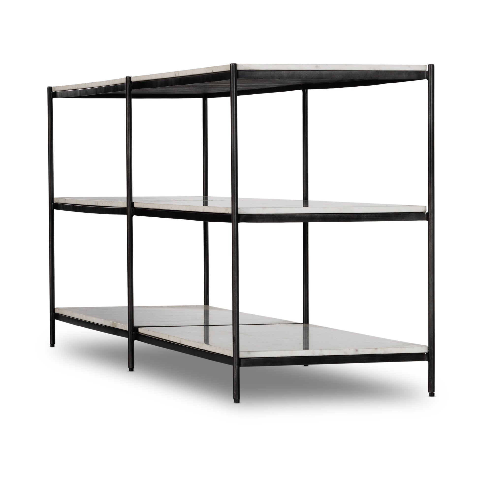 Hammered grey-finished iron frames three tiers of polished white marble, for an open look with plenty of surface space.