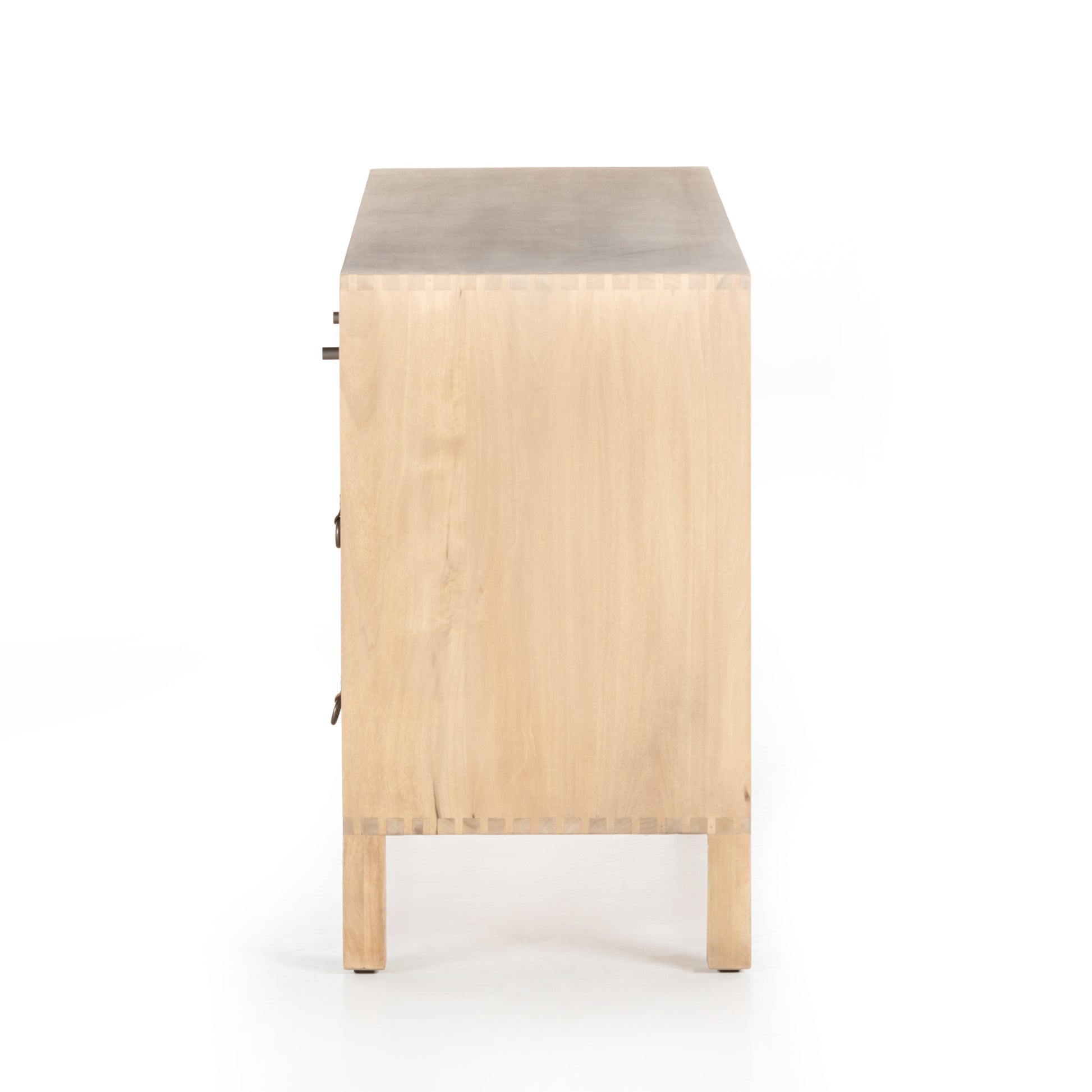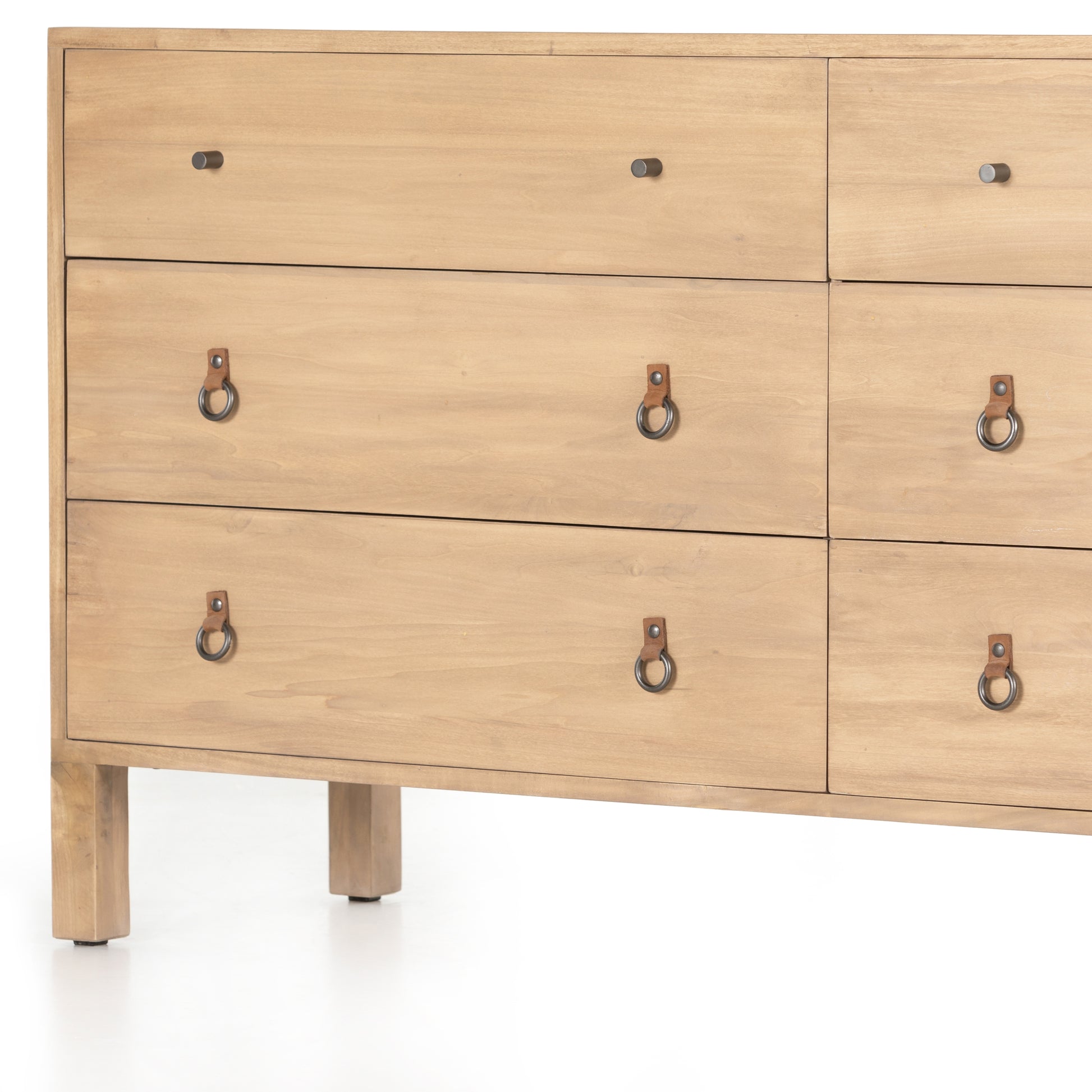 Beautifully simple in spirit. Solid dry-washed poplar forms a spacious six-drawer dresser, with dovetail joinery plus iron and leather hardware for a fresh, material-driven update to Shaker-inspired styling.