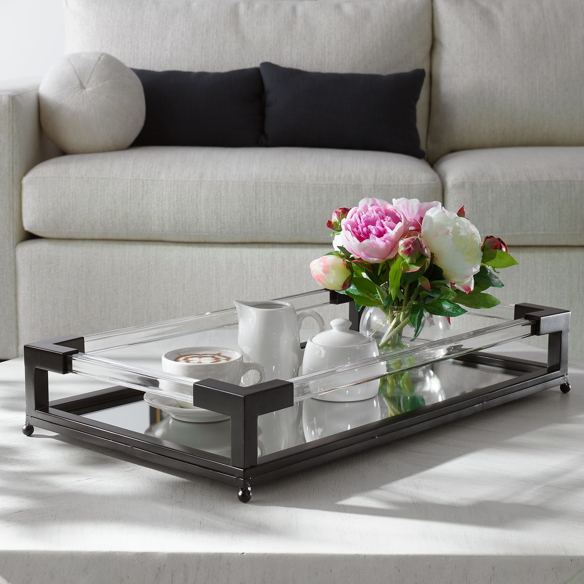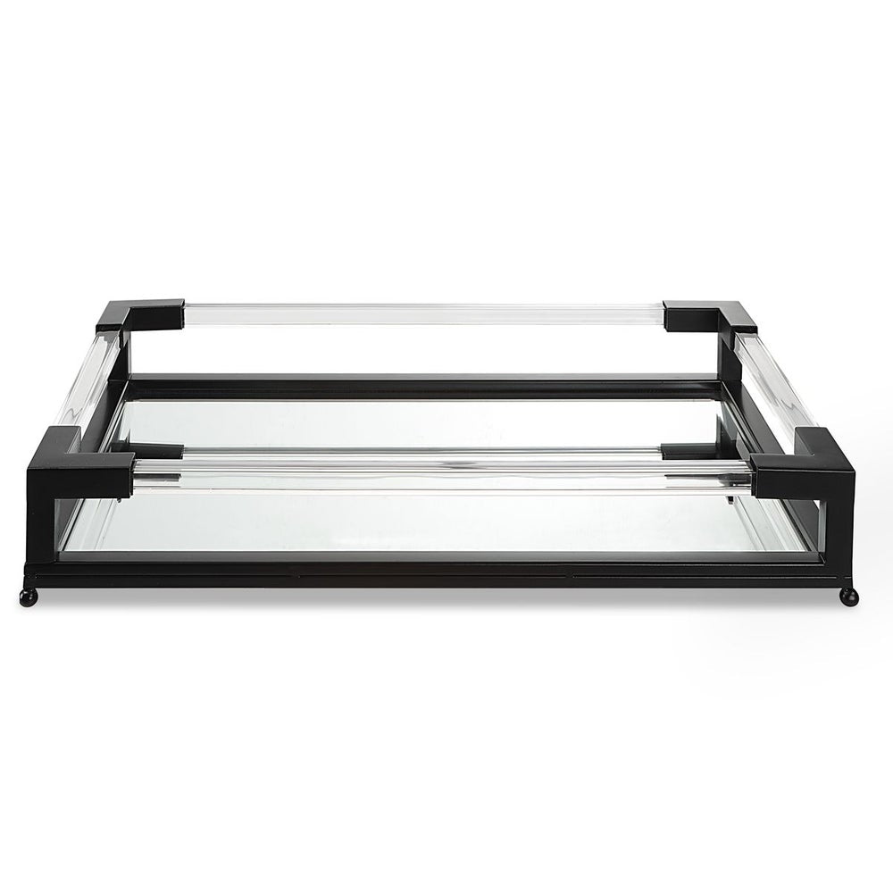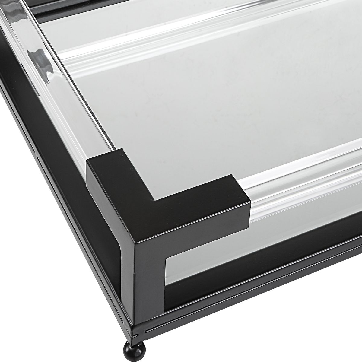 Hand forged iron frame finished in lightly antiqued gold leaf accented with suspended, clear acrylic, solid square bars and a beveled mirror interior.