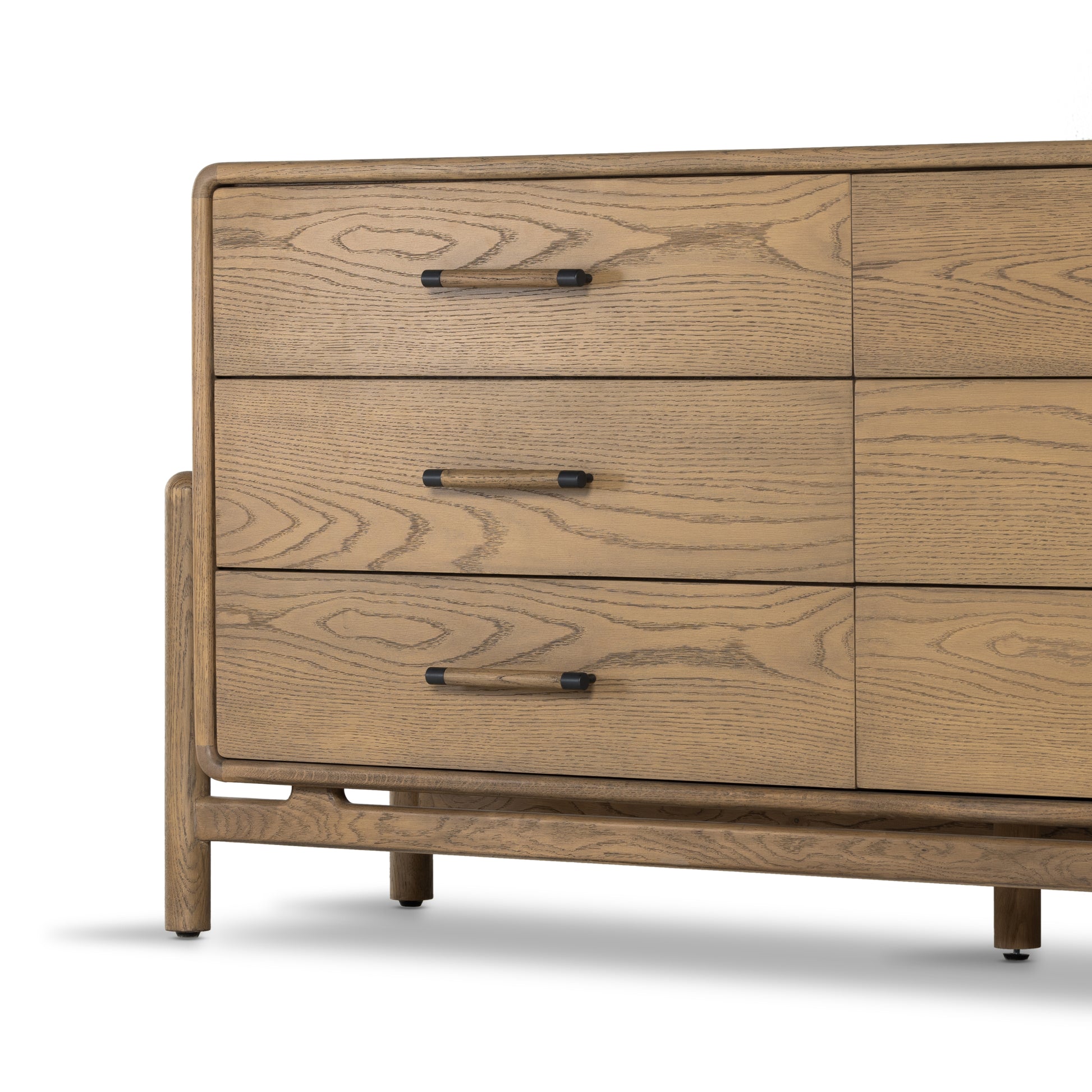 Made from light-smoked oak, six spacious drawers bring generous storage to the bedroom. Cradle-style base ups the intrigue.