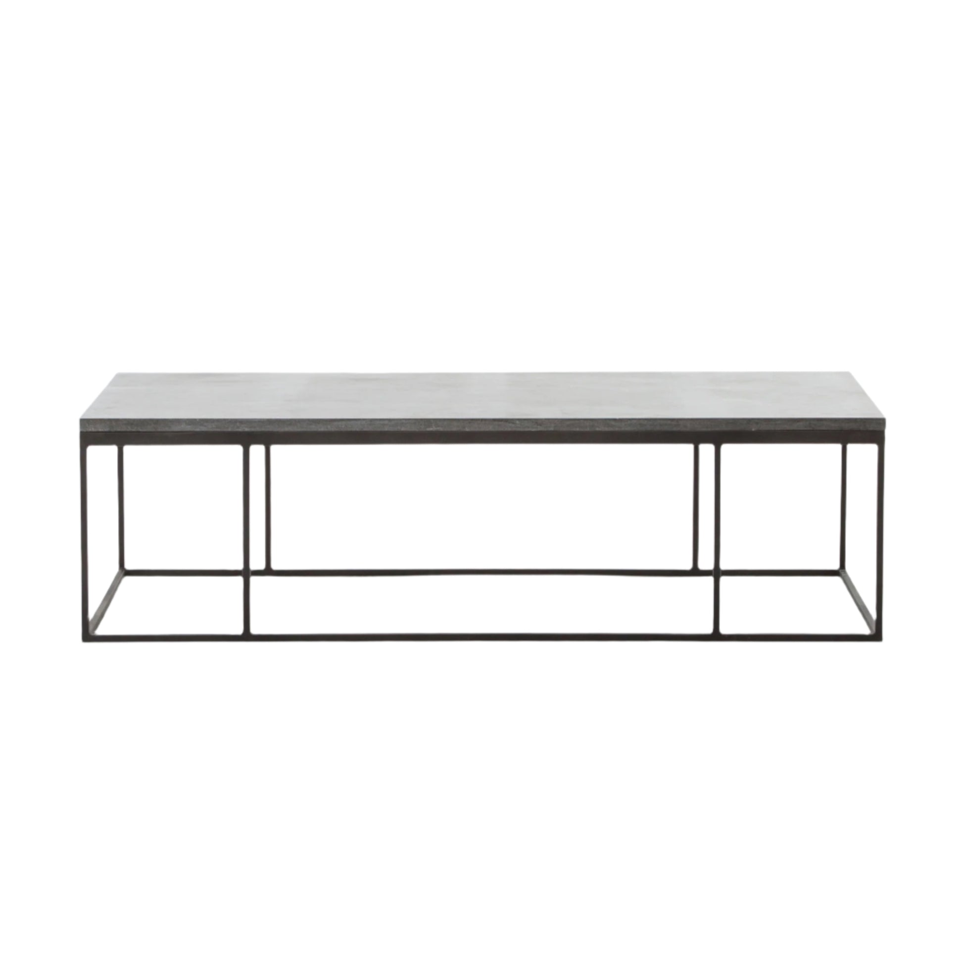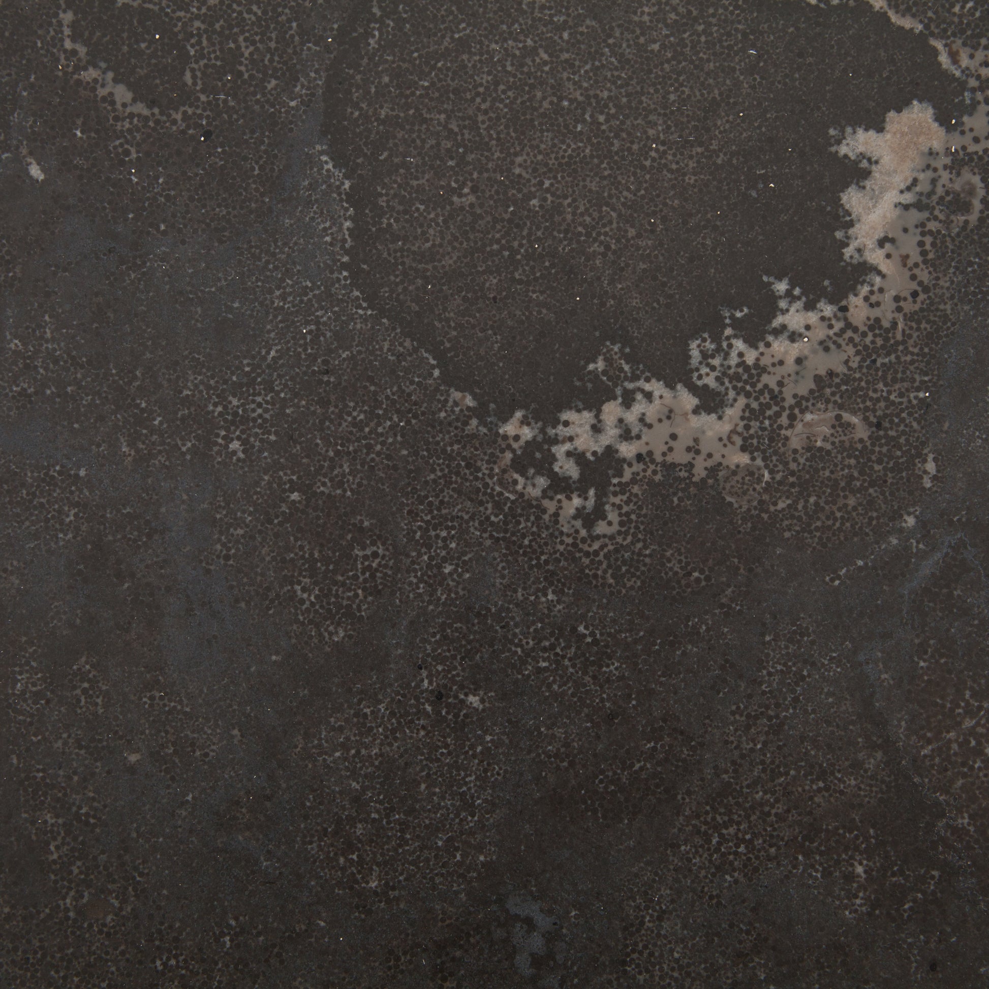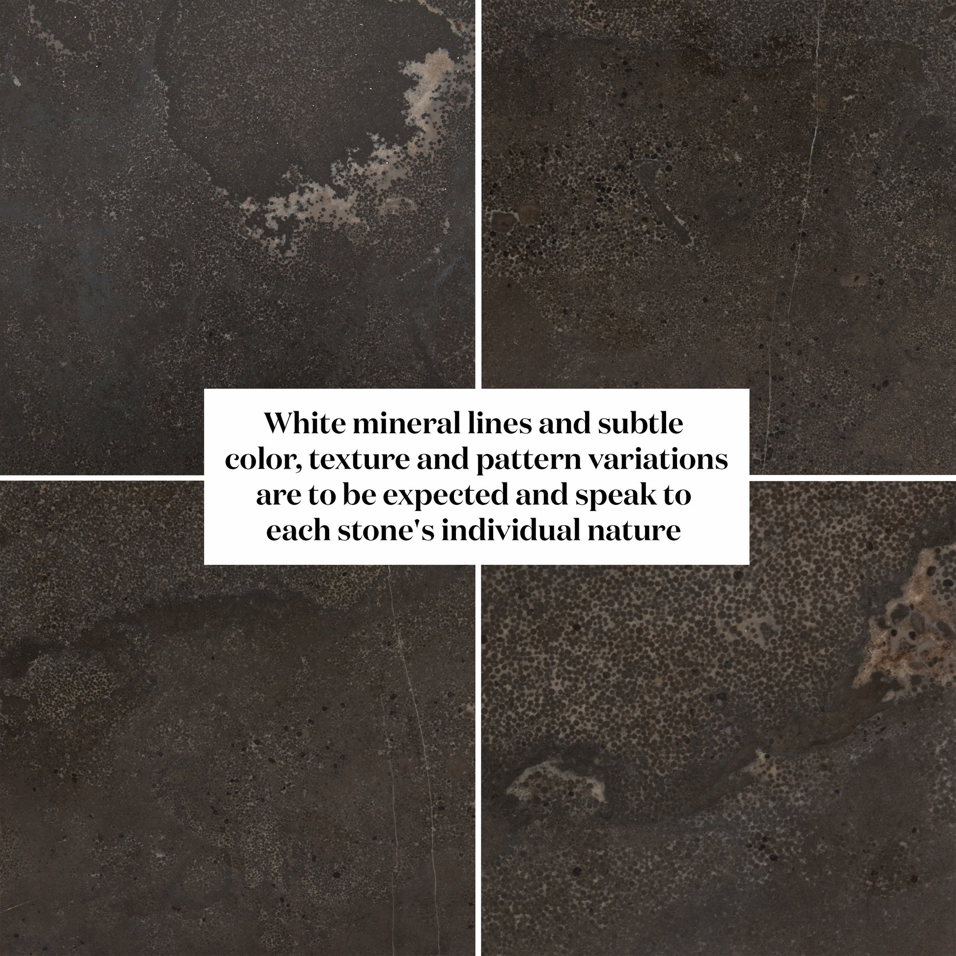 Spare beauty, casual elegance. Finished in a slick gunmetal, a clean Parsons-style base features hand-rubbed, dimensional edging, with a rough-hewn bluestone slab that feels both found and perfectly placed. White mineral lines and subtle color, texture and pattern variations are to be expected and speak to each stone's individual nature.