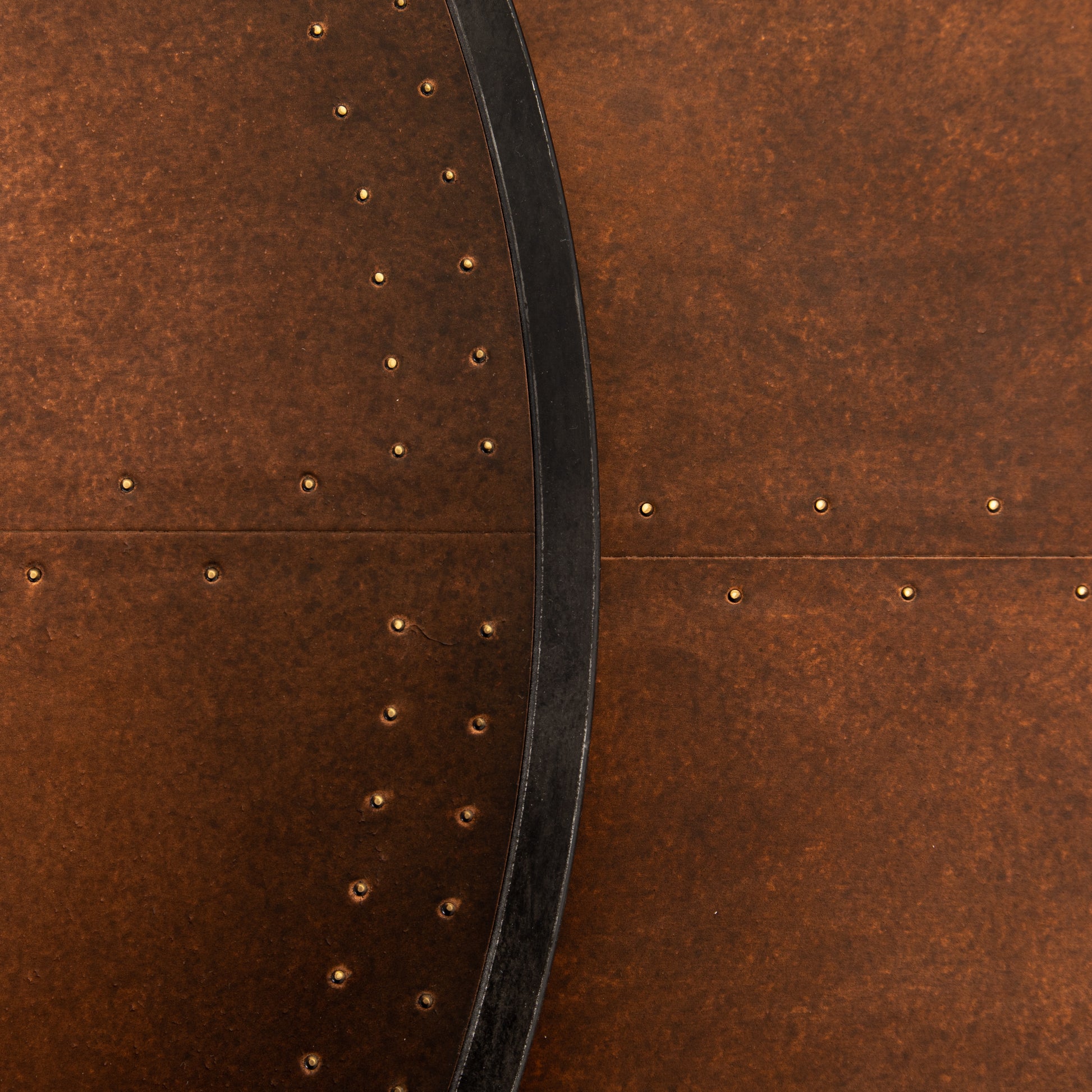 Eye-catching, entertaining layers are designed to slide together or apart, effortlessly. Slender bases support rounded, antiqued copper-clad table tops with double rows of contrasting nail heads.