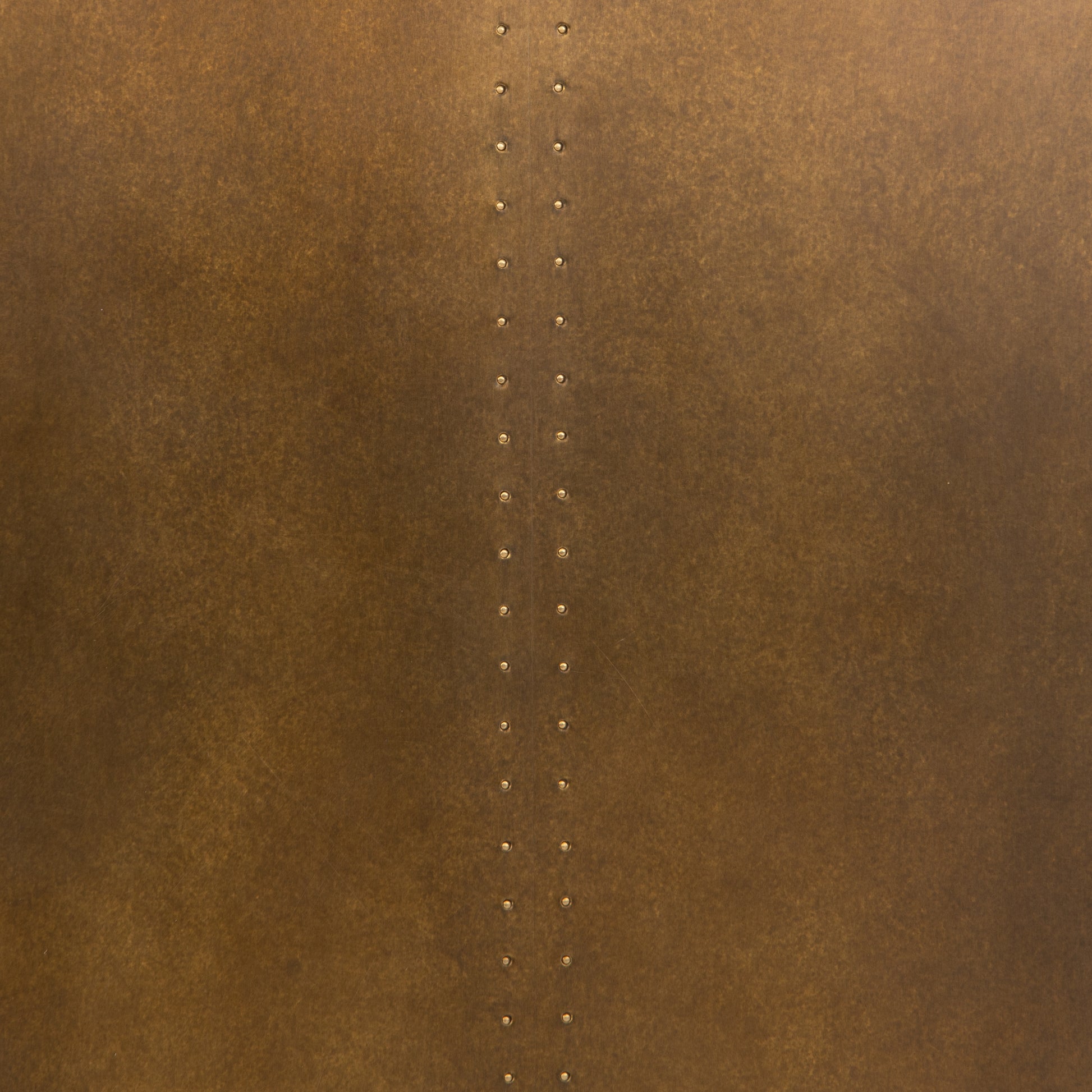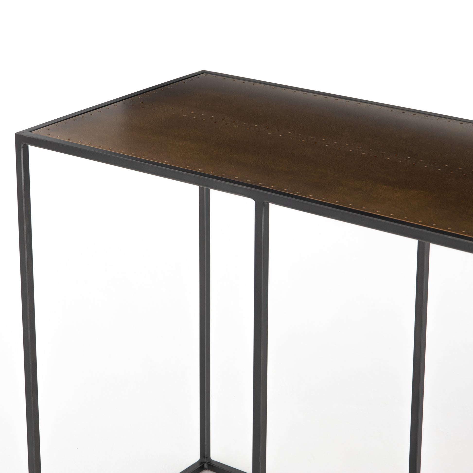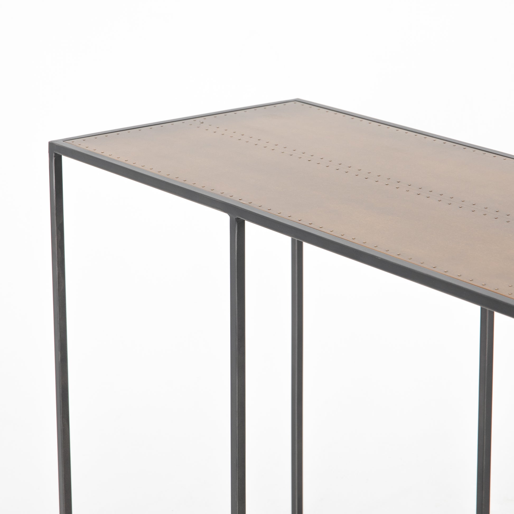 A slender metal frame is finished in antique bronze for clean, linear impact. A bright brass-clad top features rows of nailhead trim to elevate its spare beauty.