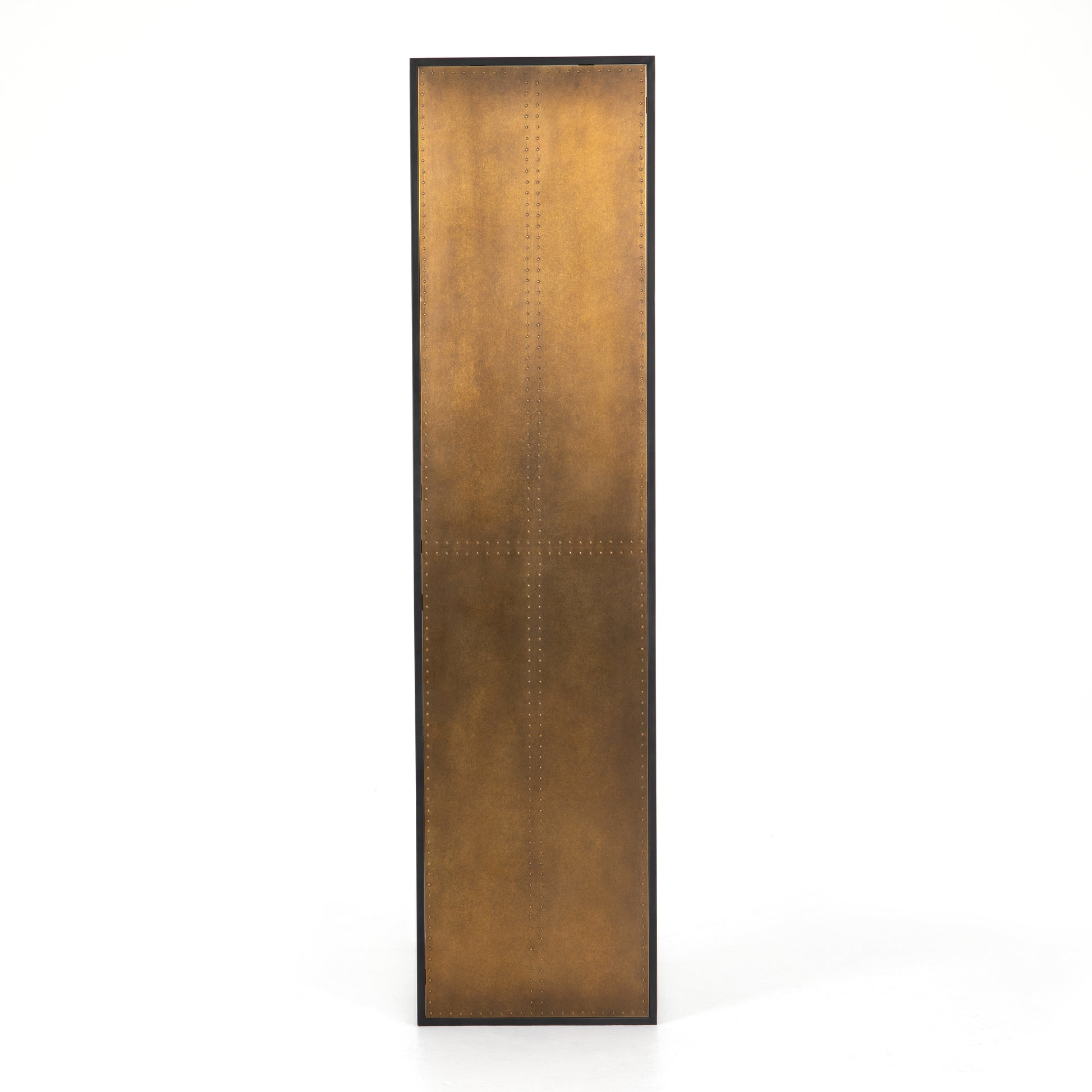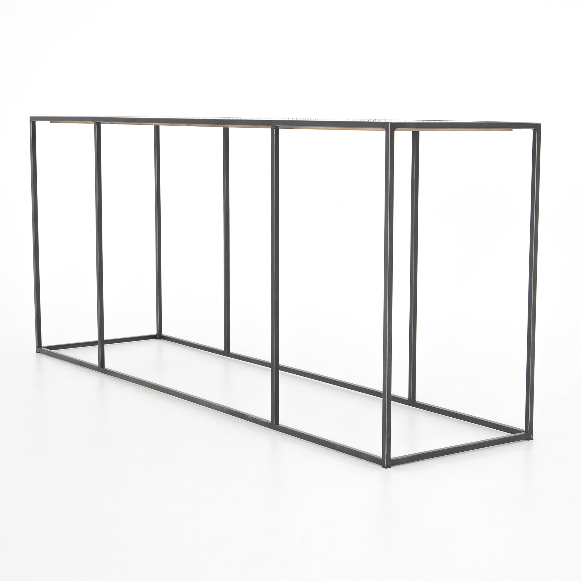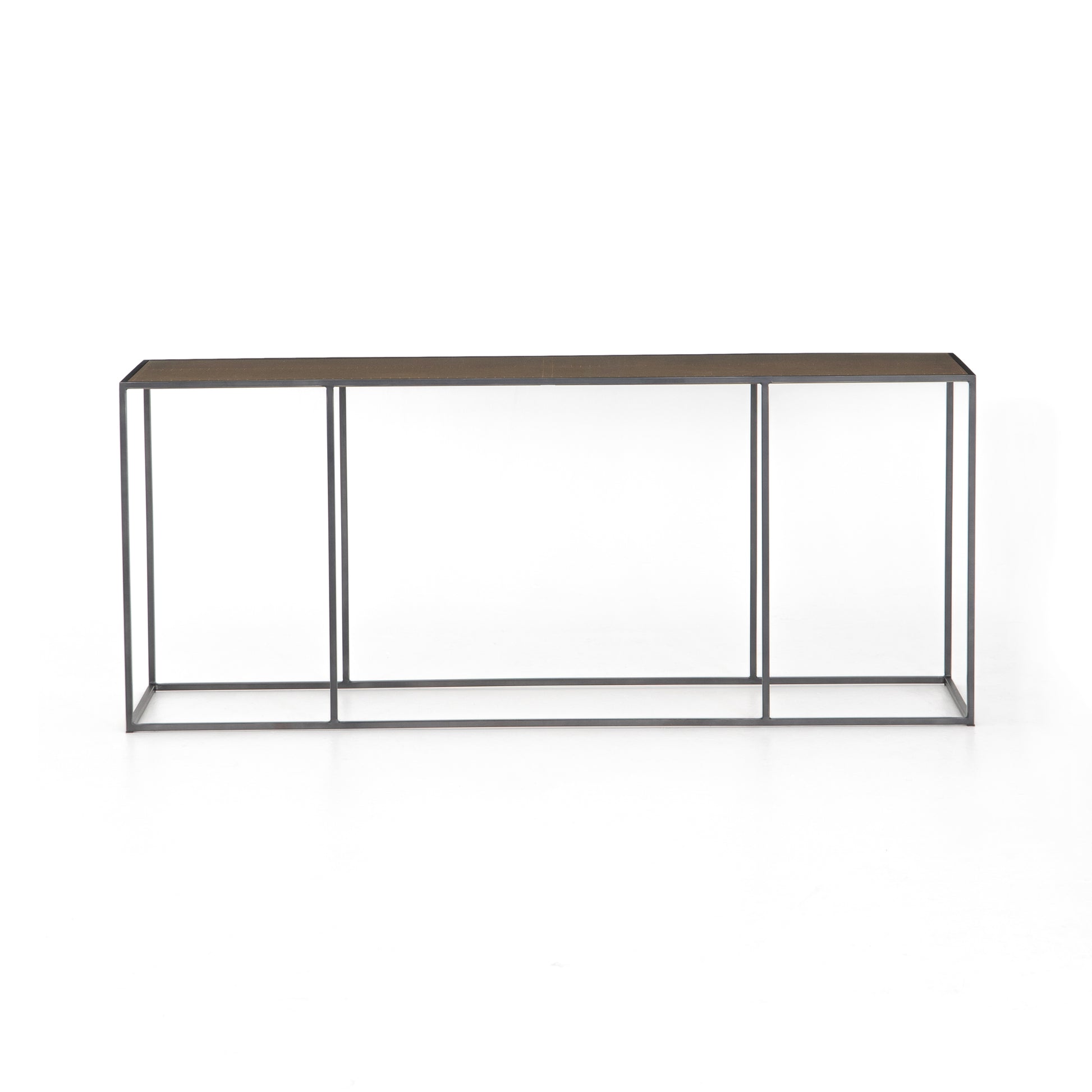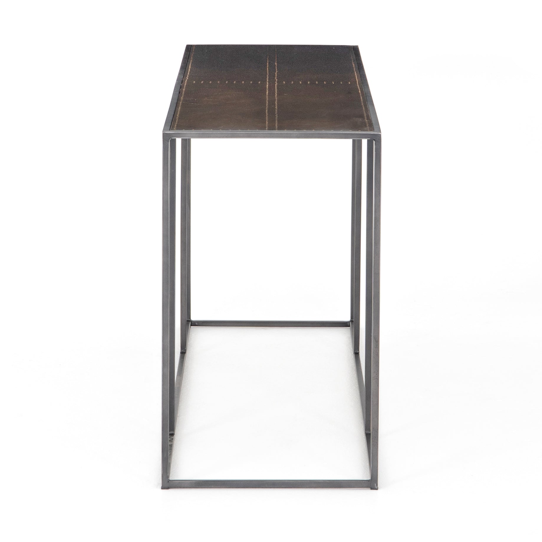 A slender metal frame is finished in antique bronze for clean, linear impact. A bright brass-clad top features rows of nailhead trim to elevate its spare beauty.