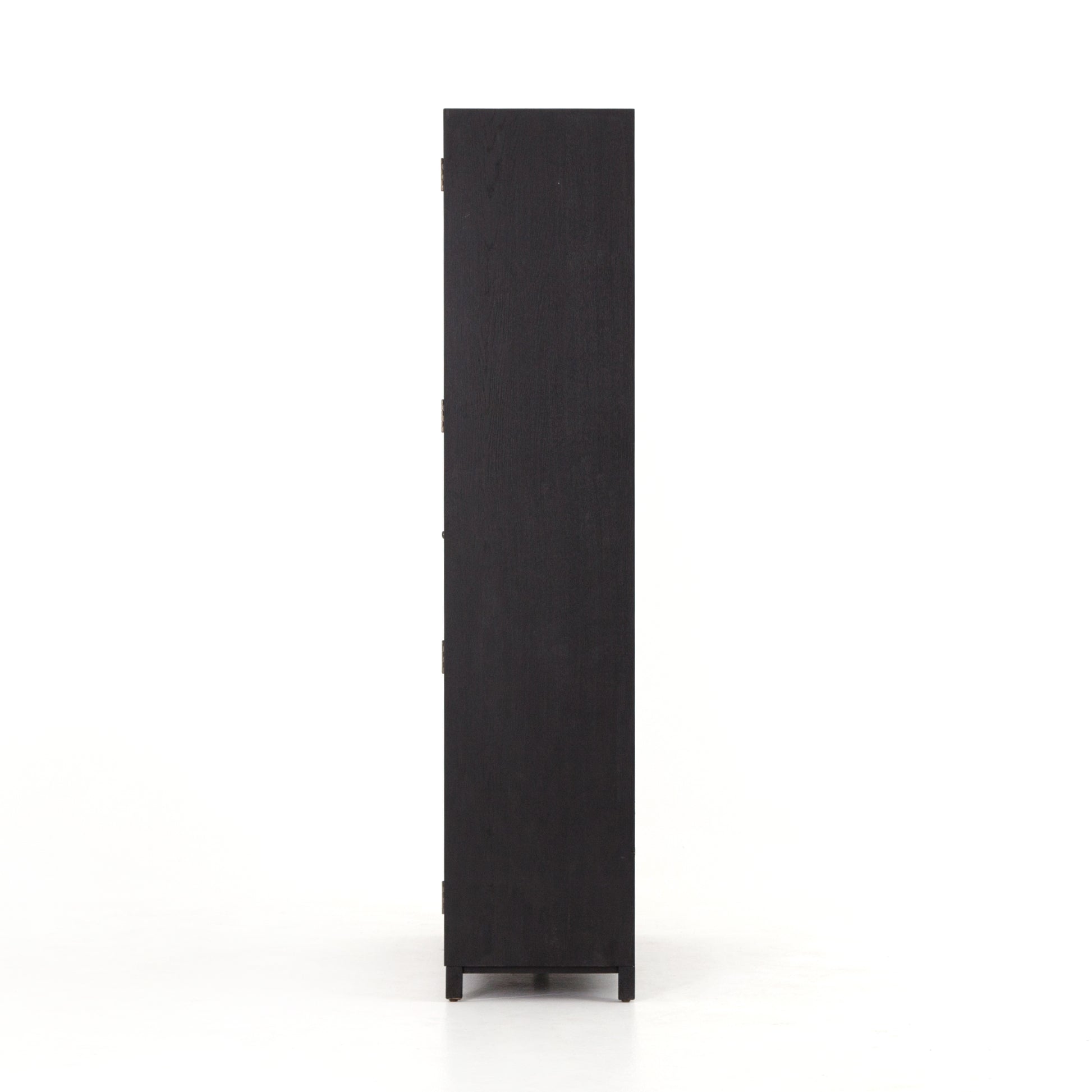 Two-tone transparency. Black drifted oak frames lighter interior shelving for a subtle but striking contrast. Glass doors allow for prized possessions to dazzle on full display while a spacious interior drawer adds an out-of-view storage option.