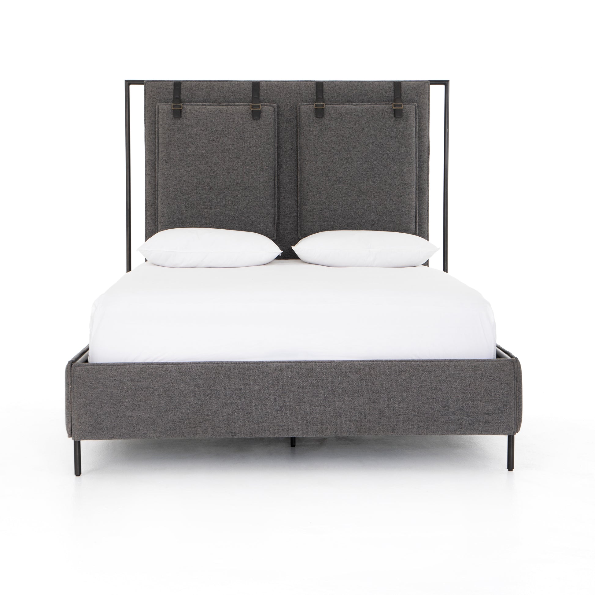 Safari styling gets a modern reboot. Linen-blend upholstery of ash grey lays a texture-rich base for a forward-thinking bedroom look. Black leather straps secure decorative headboard pillows, suspended for eye-catching effect. Box spring required. This bed is not compatible with an adjustable mattress.