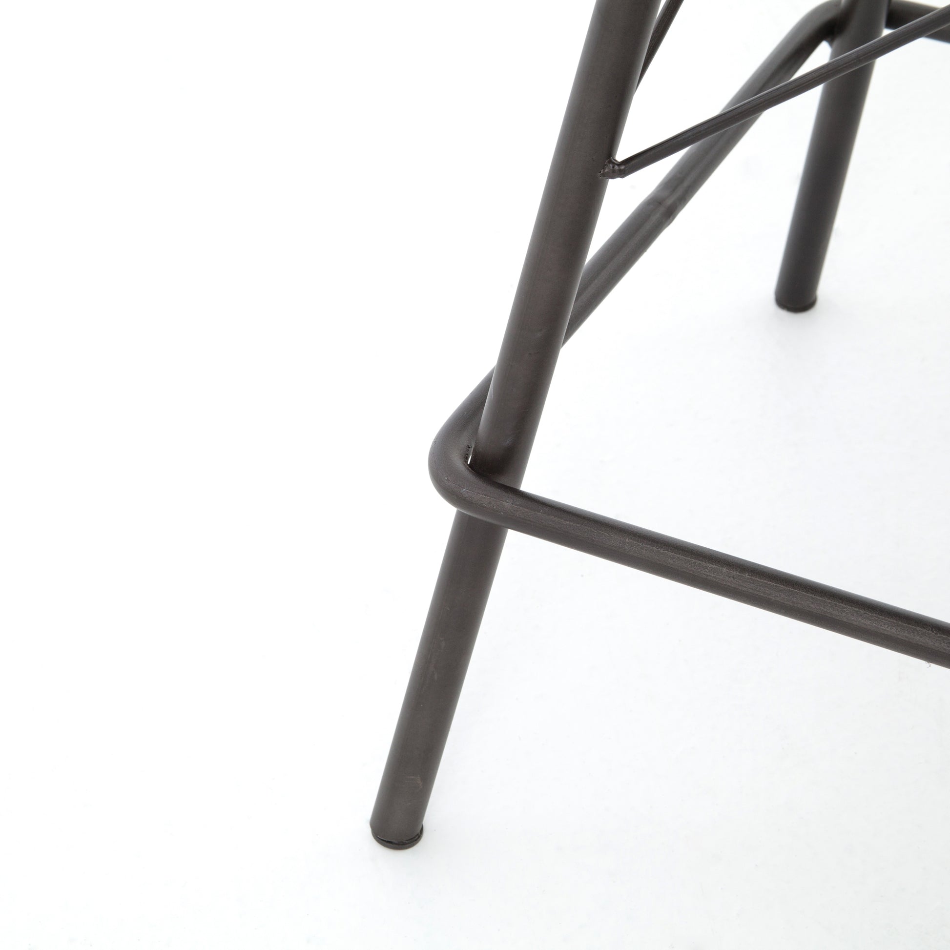 Mid-century styling adds comfort to the counter. Modern S-curves in distressed, brown leather swivel 360 degrees above an architectural, black-waxed iron base.