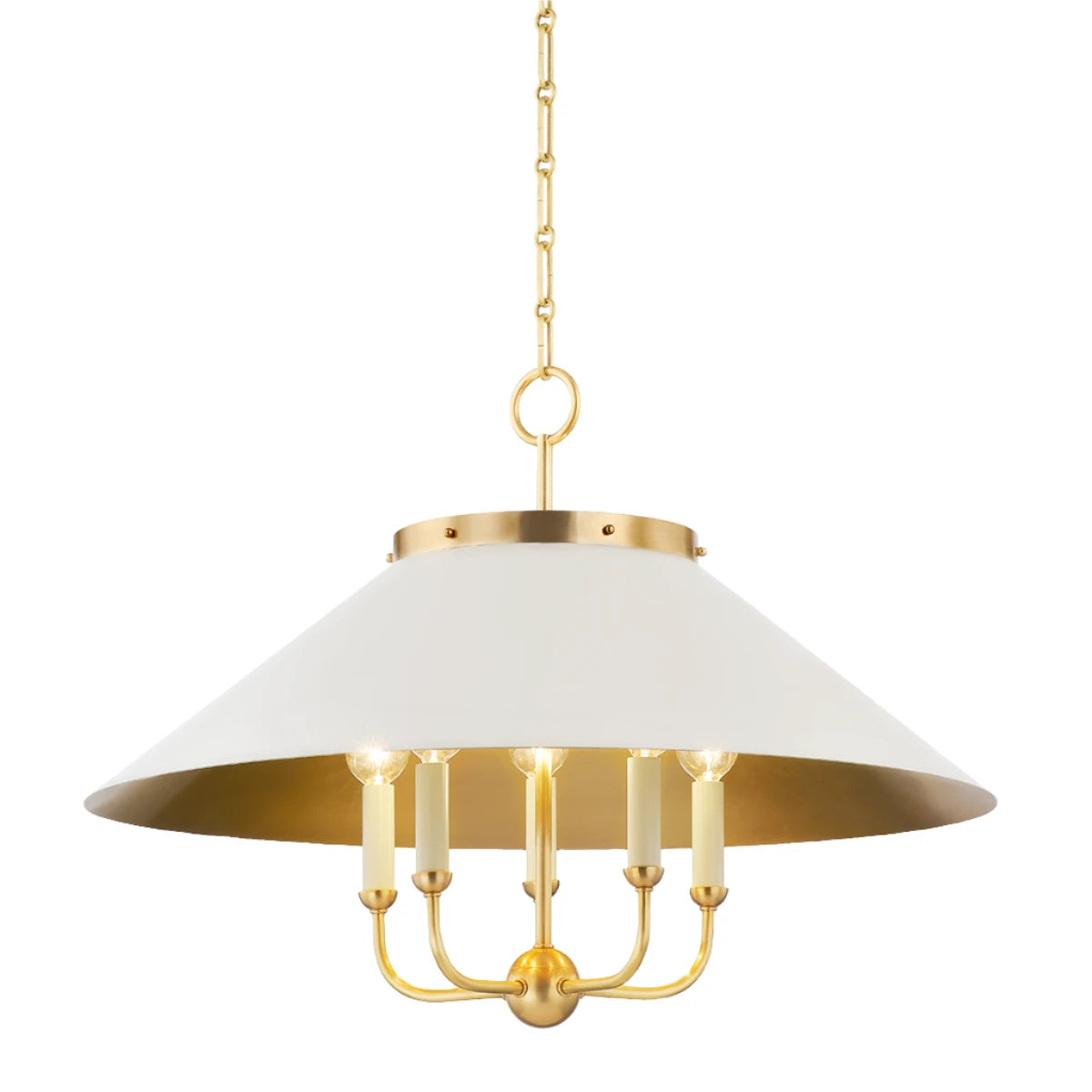 This classic metal shade design feels special with fresh finish combinations and sleek, heritage-inspired details. The contrastiing Aged Brass accents and modern gooseneck arm allow the pendants and sconce an updated, yet classic feel. The tapered shade over a five-light candelabra give the chandelier new traditional appeal. Each fixture features an Aged Brass or Polished Nickel shade that is metal on the inside and painted Off-White, Distressed Bronze or Bird Blue on the outside. Part of our Mark D. Sikes collection.