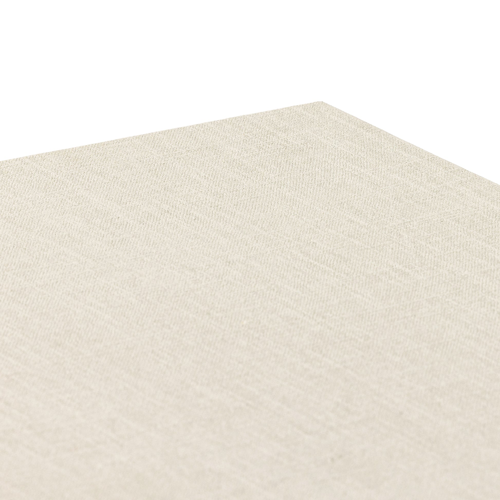 Talk about novelty. Made from painted linen in a light ivory, arched legs soften otherwise clean, modern shaping. Three drawers bring bonus storage space to the living or media room, while half-moon iron hardware adds a hint of art deco style.
