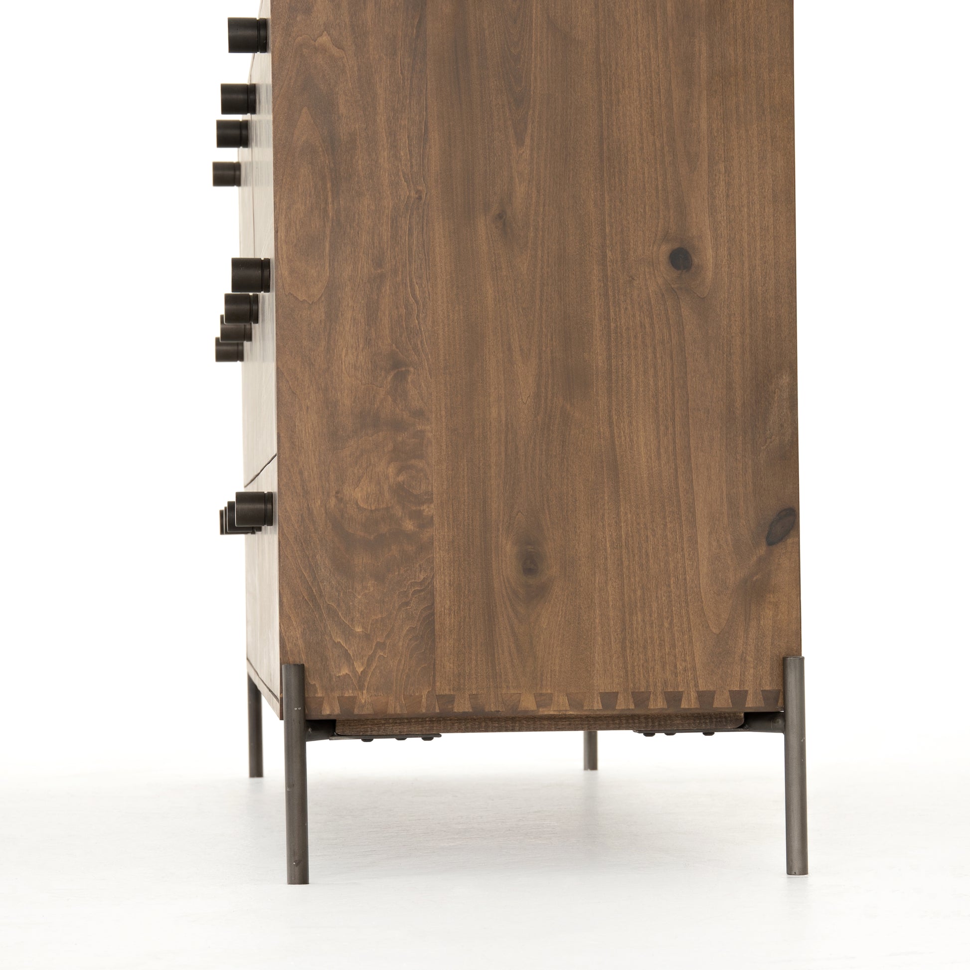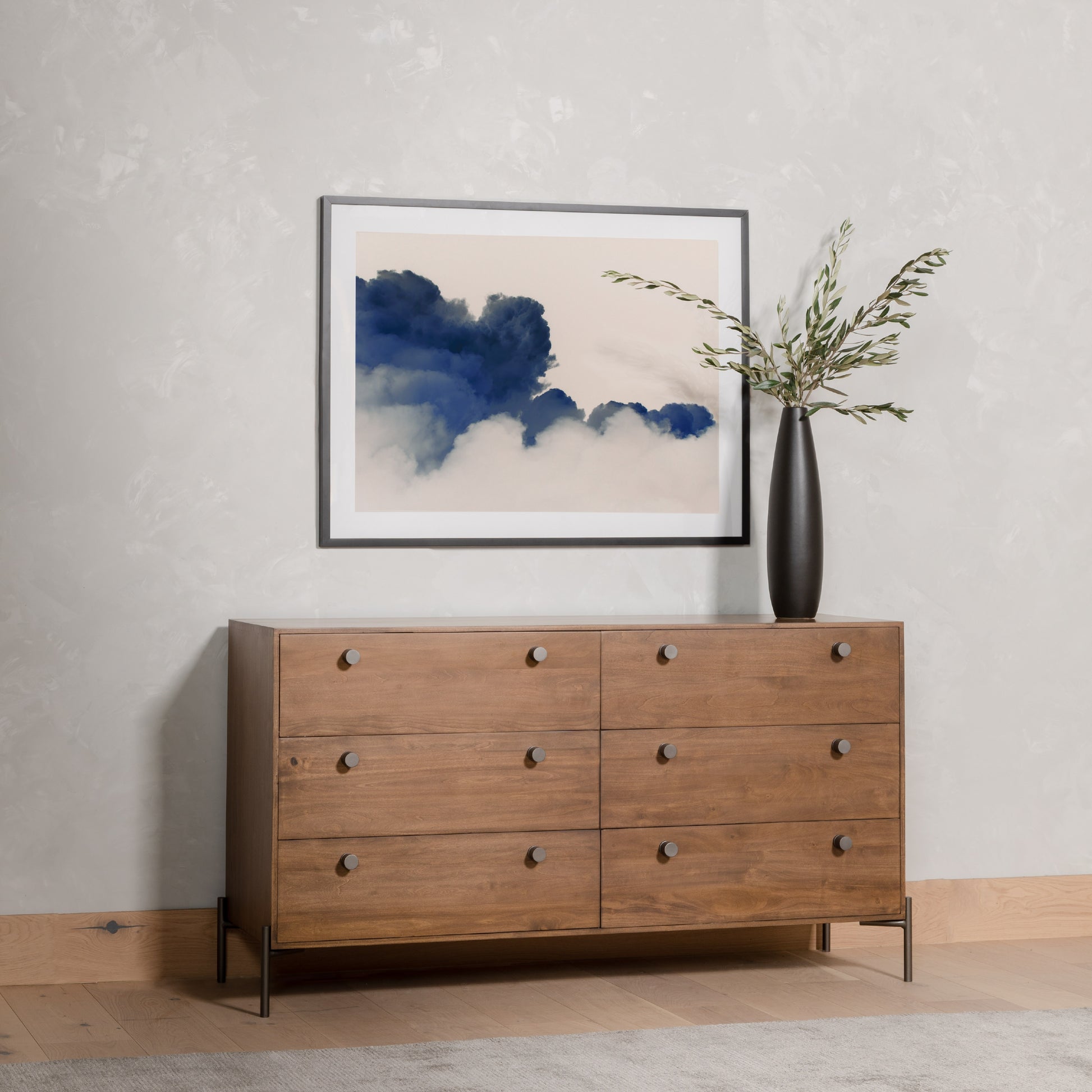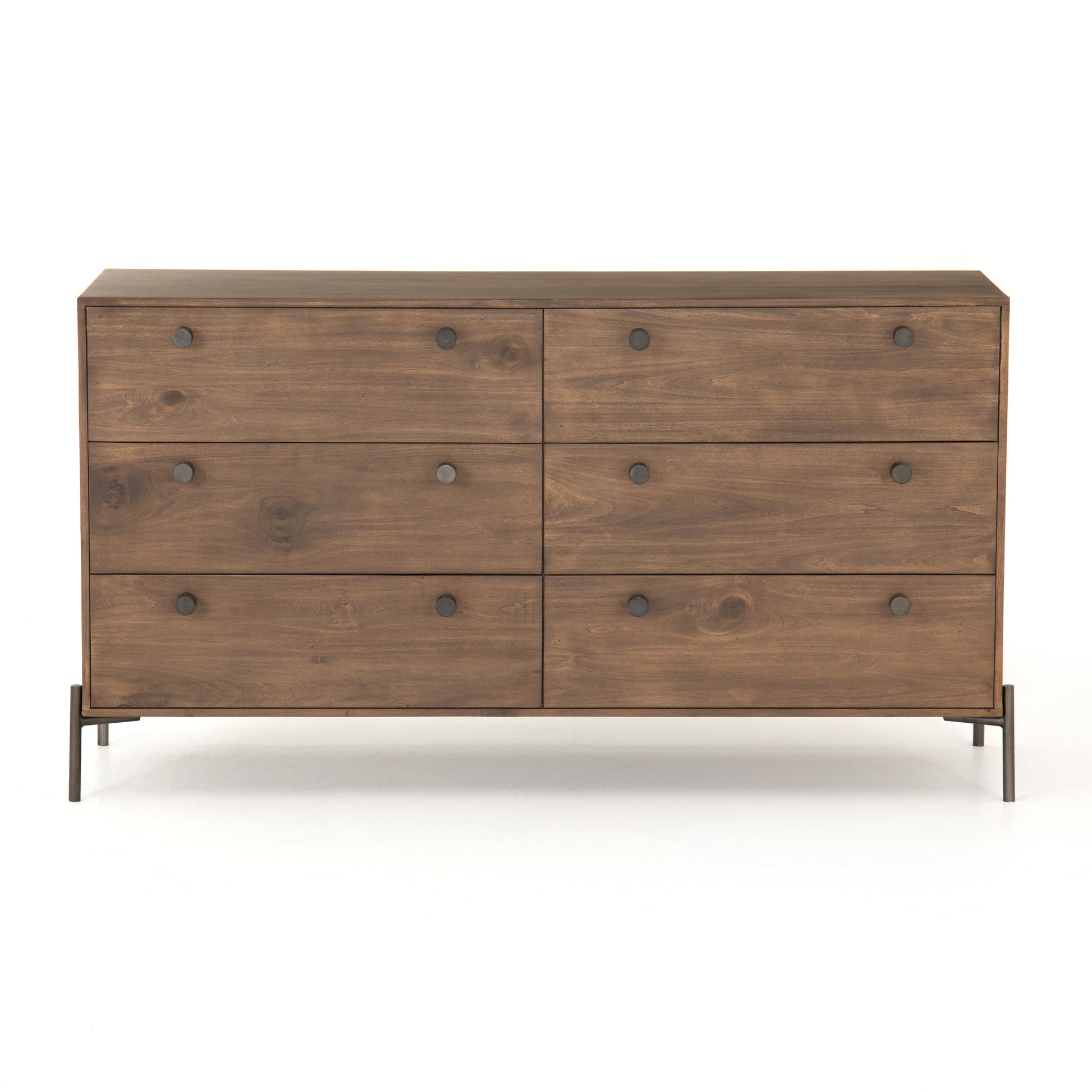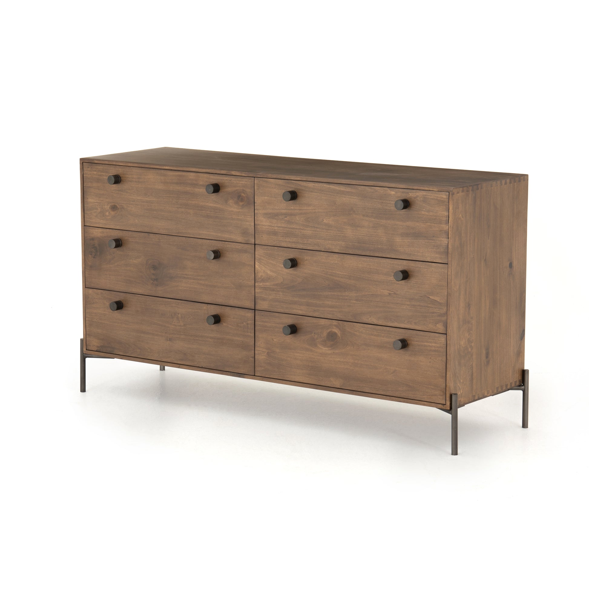 A deep and spacious solid poplar dresser inspired by vintage drawer chests is updated with linear iron framing. Cylindrical iron knobs add to the heirloom quality.