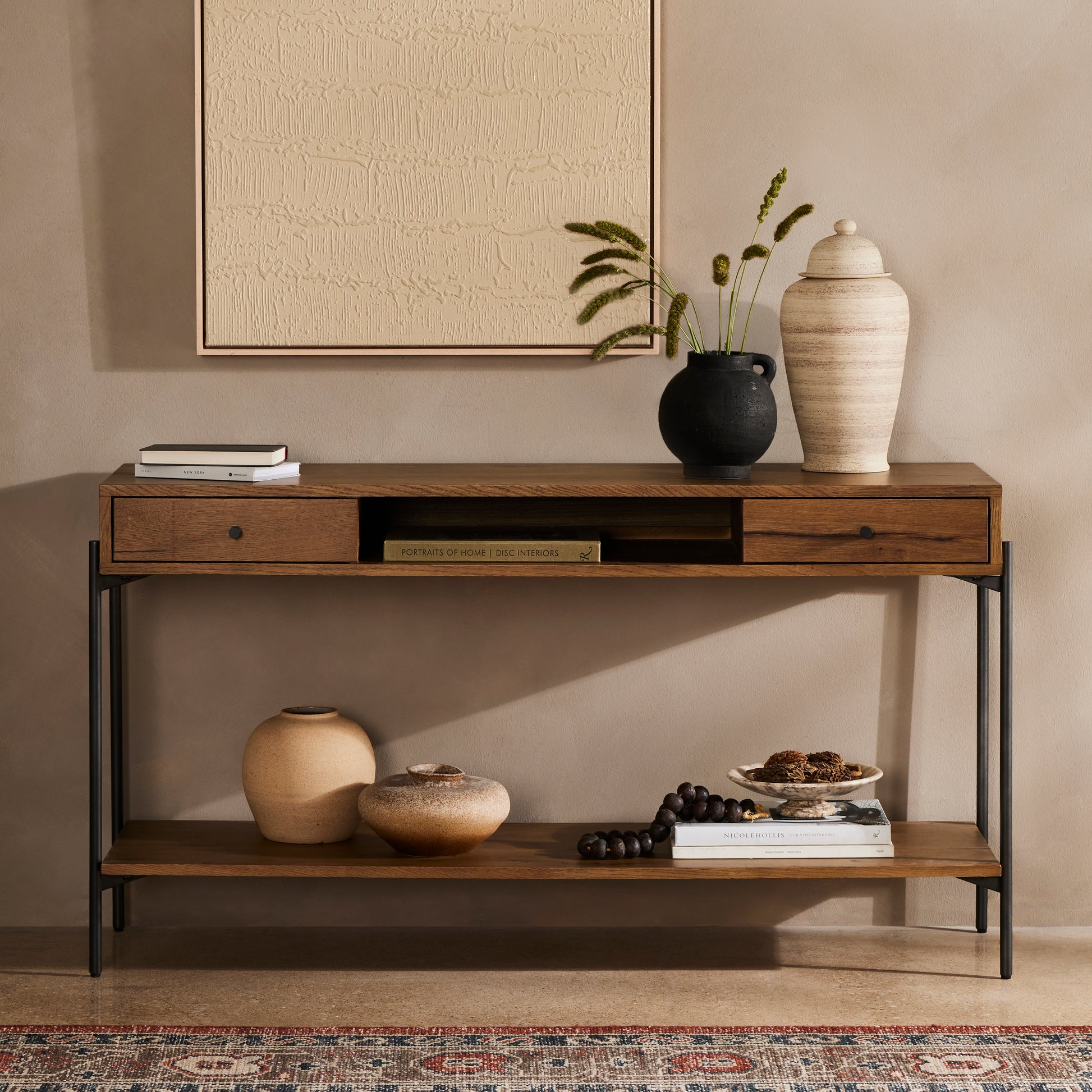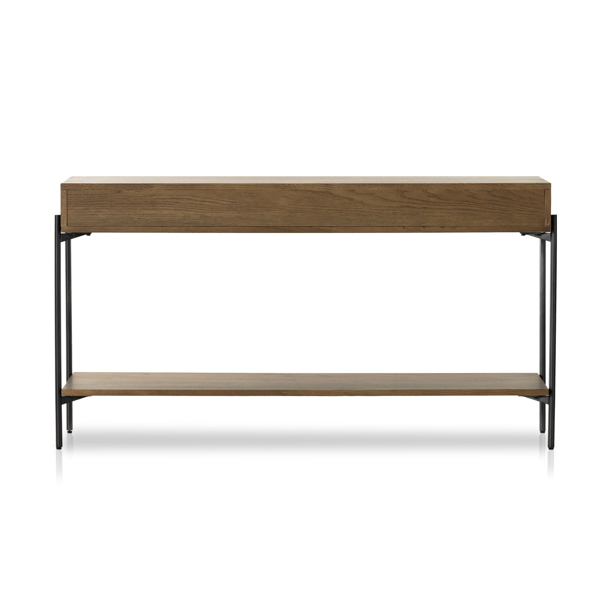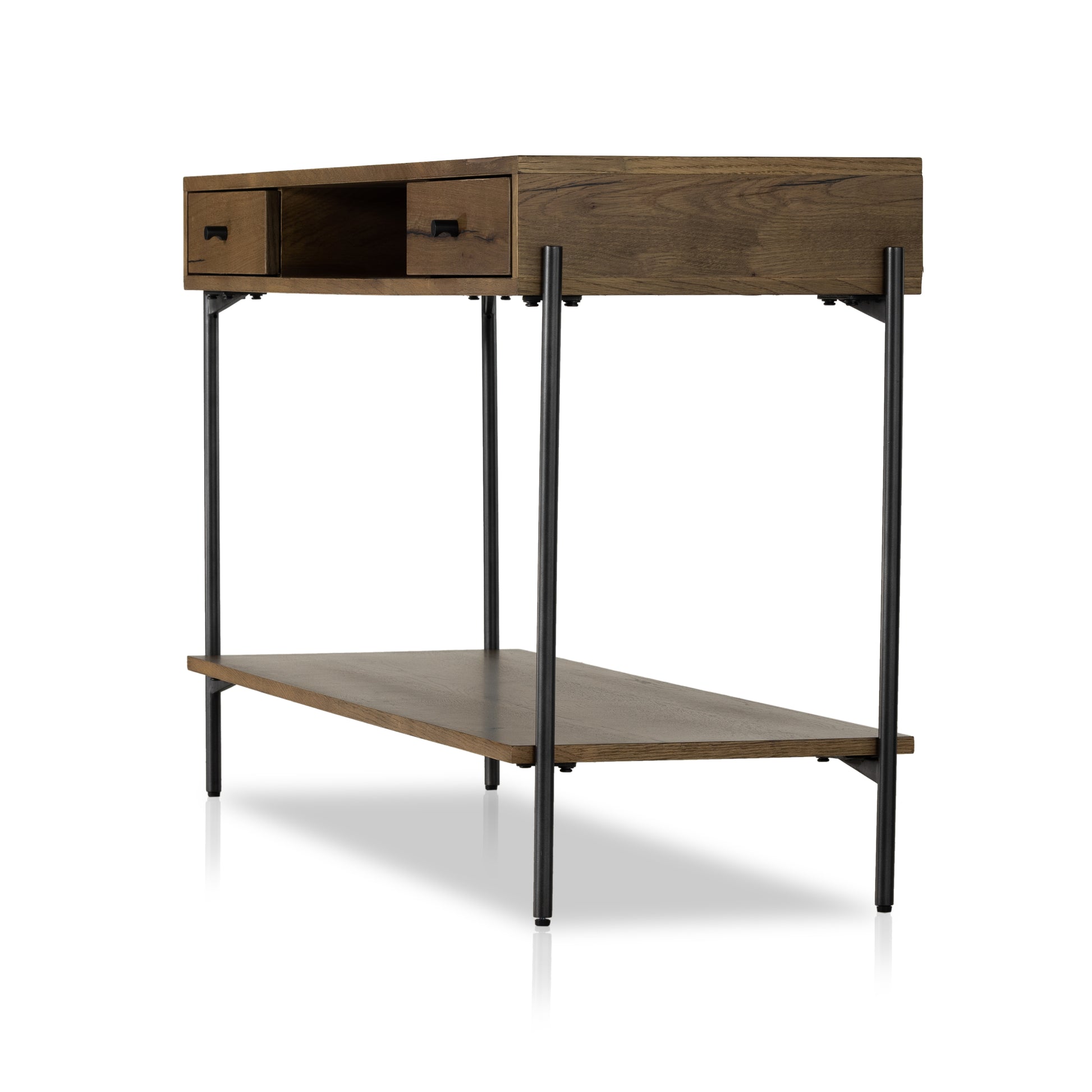 A slight cradle base of gunmetal-finished iron supports this console table, with an amber oak finish for the upper and lower display. Equipped with two drawers for storage convenience.