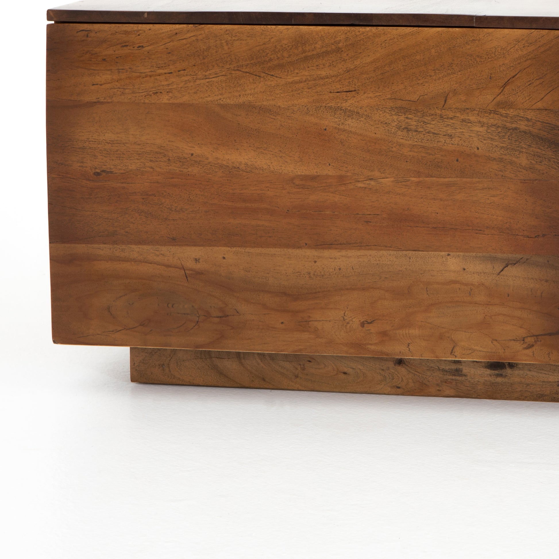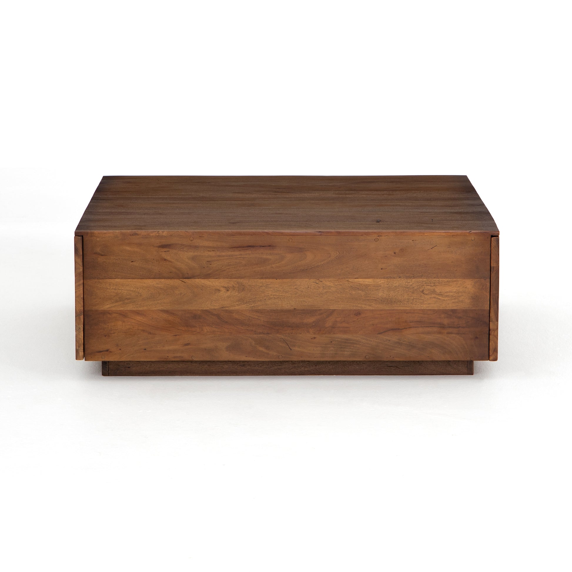 Rich, reclaimed woods deliver depth beyond streamlined shaping. Warm brown tones reveal natural knots and graining for a distinctively found feel. Spacious drawers are concealed to serve up this coffee table’s finest features. Plinth base adds a modern touch.