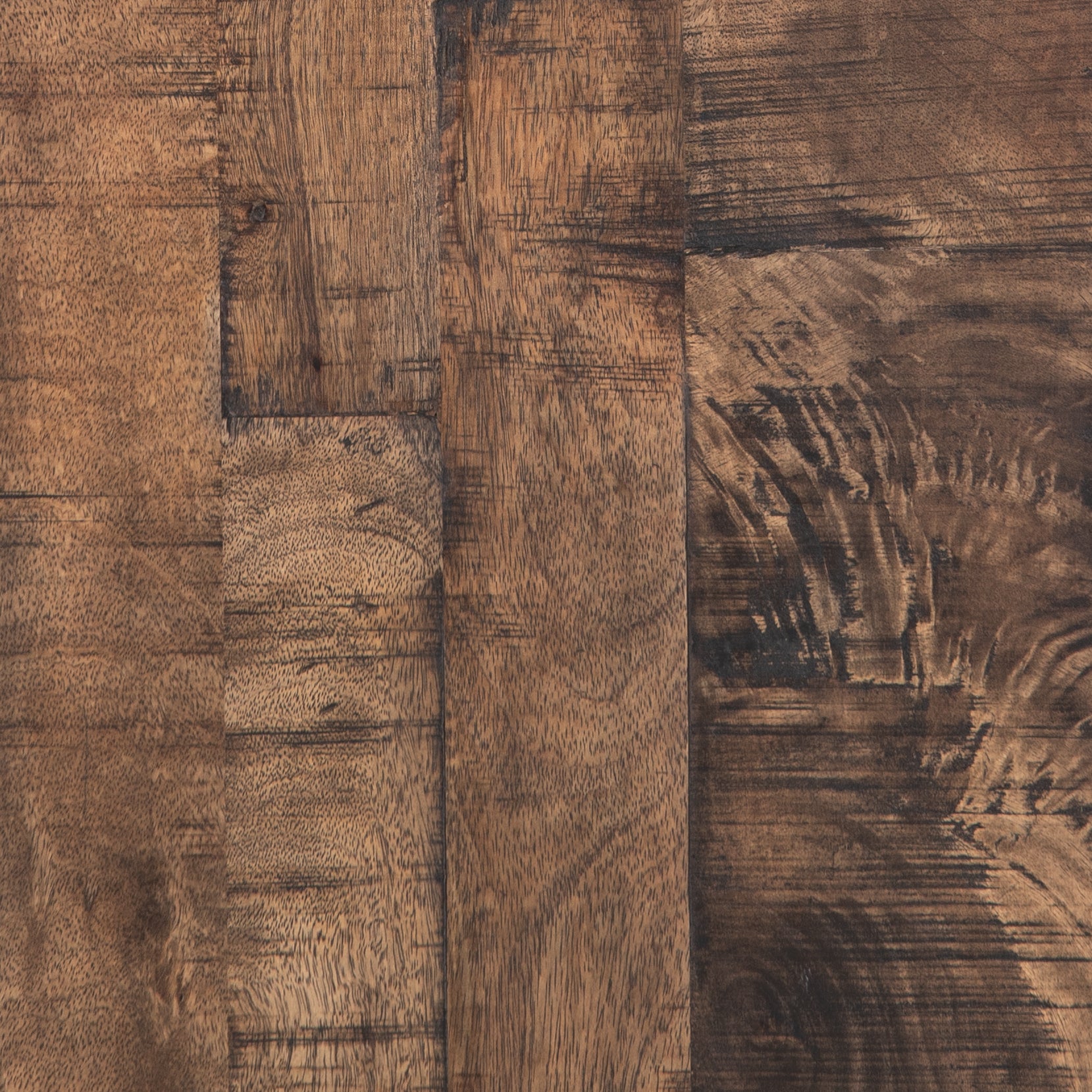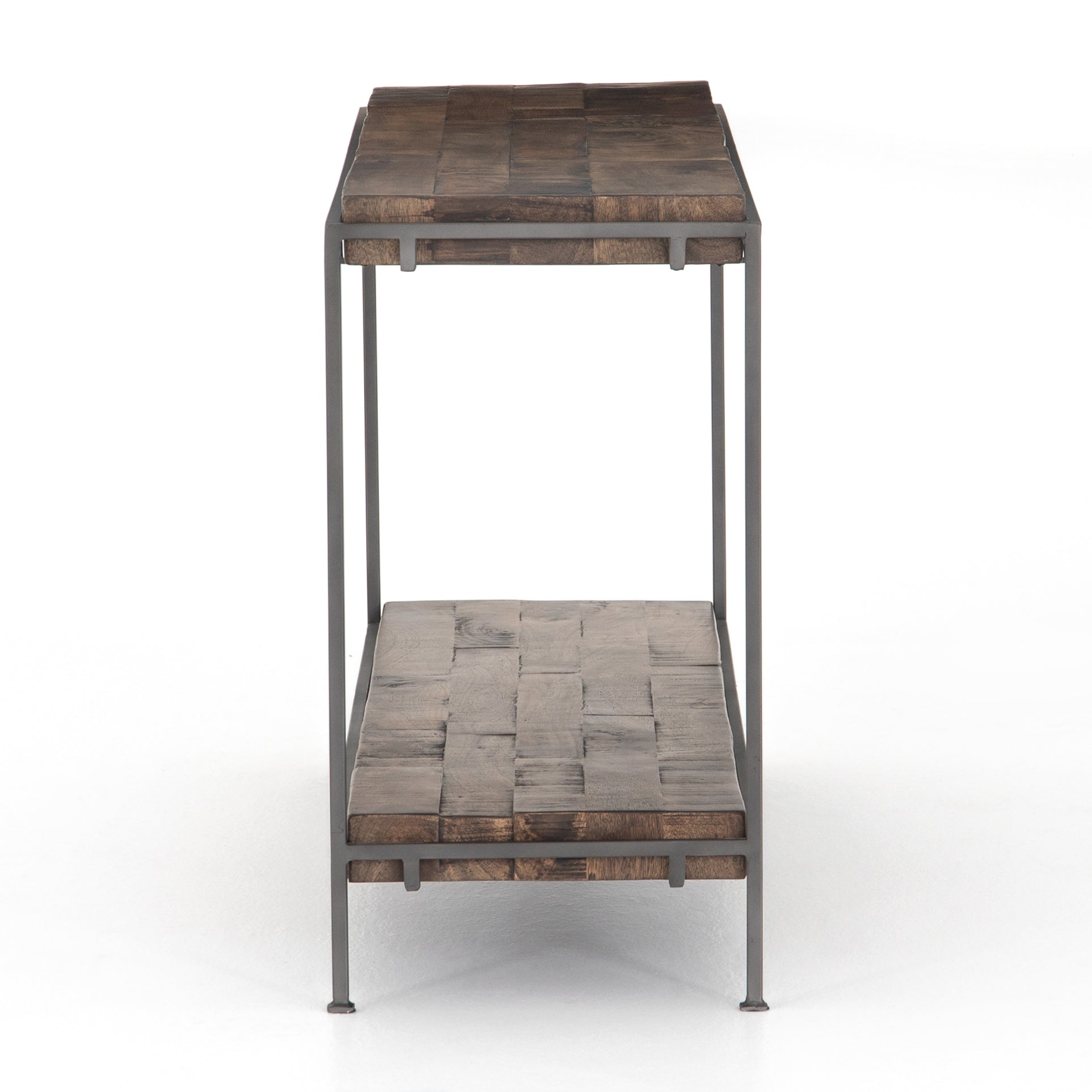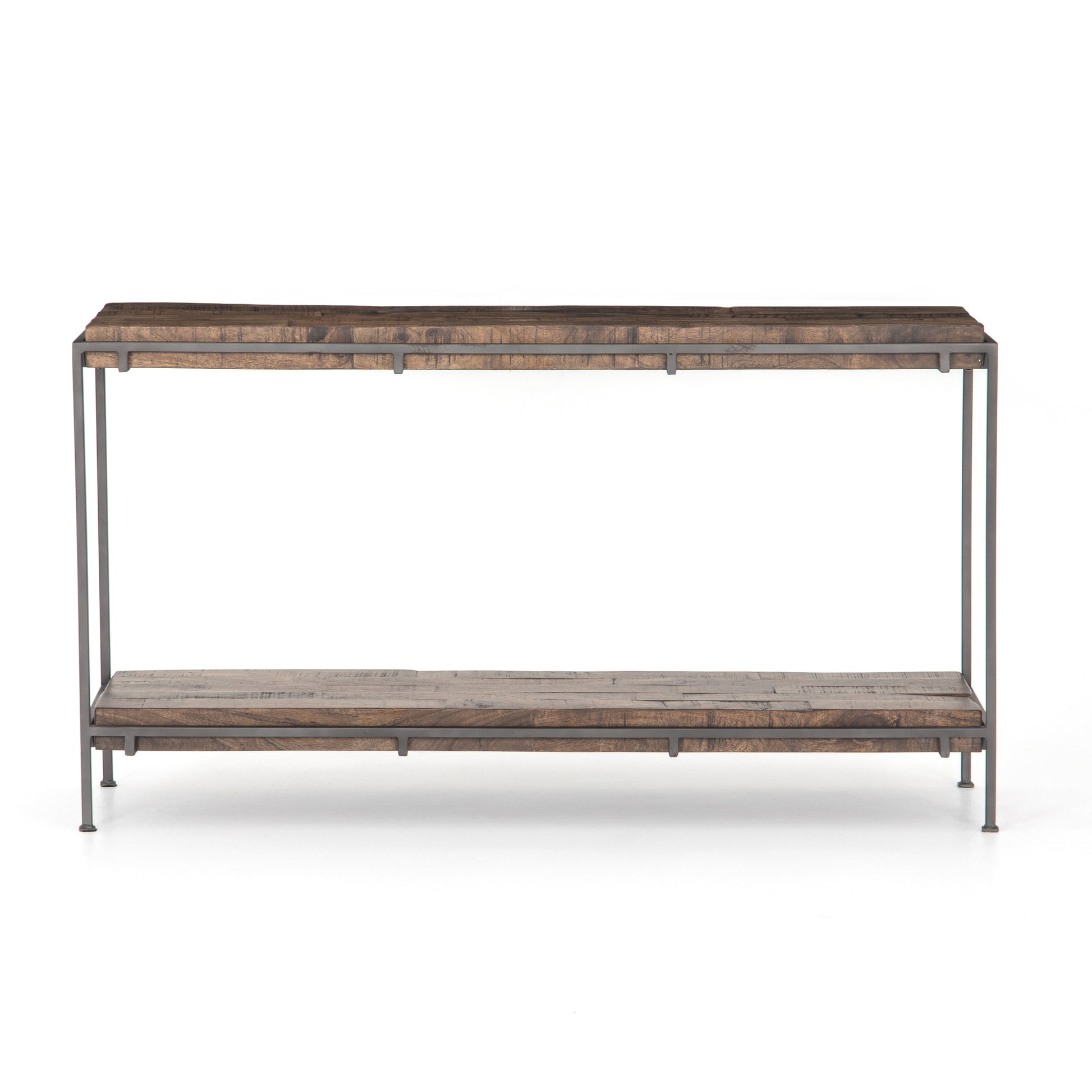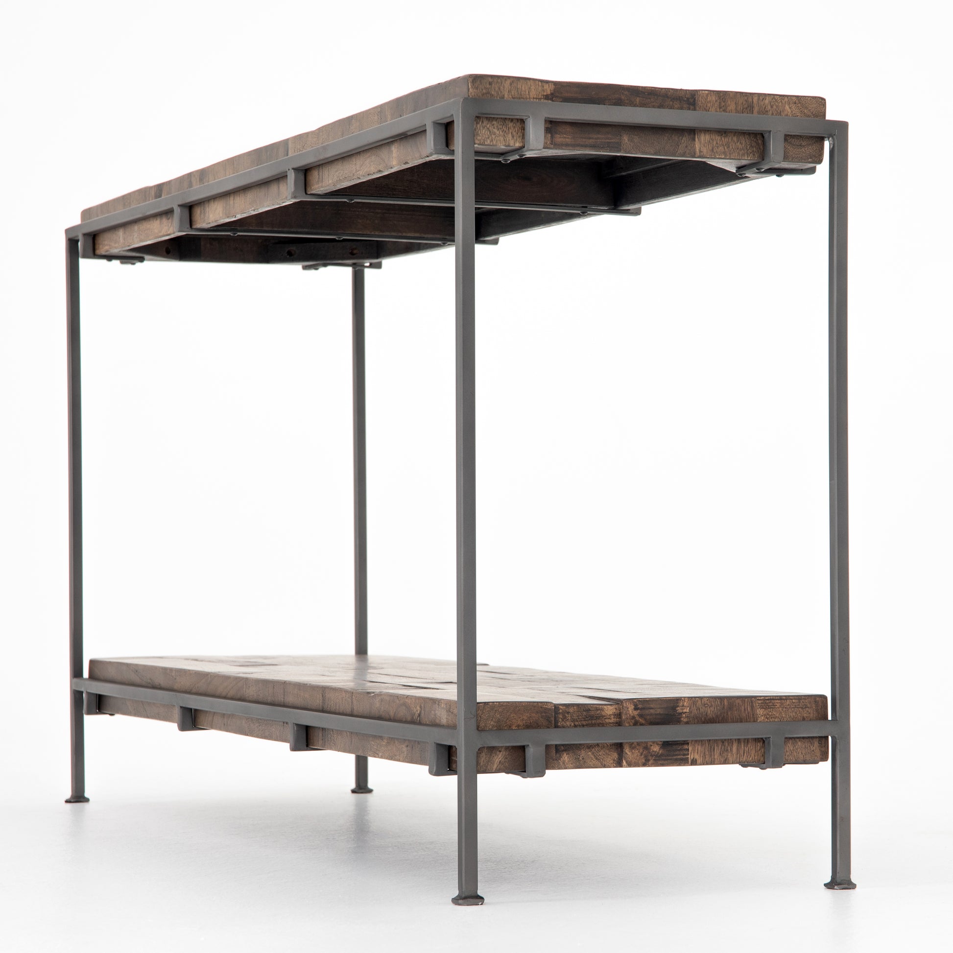 Weathered hickory tones bring warmth to open-air console storage. Thick slabs of mango wood stack for a tiered, open look with cage-like iron detailing.