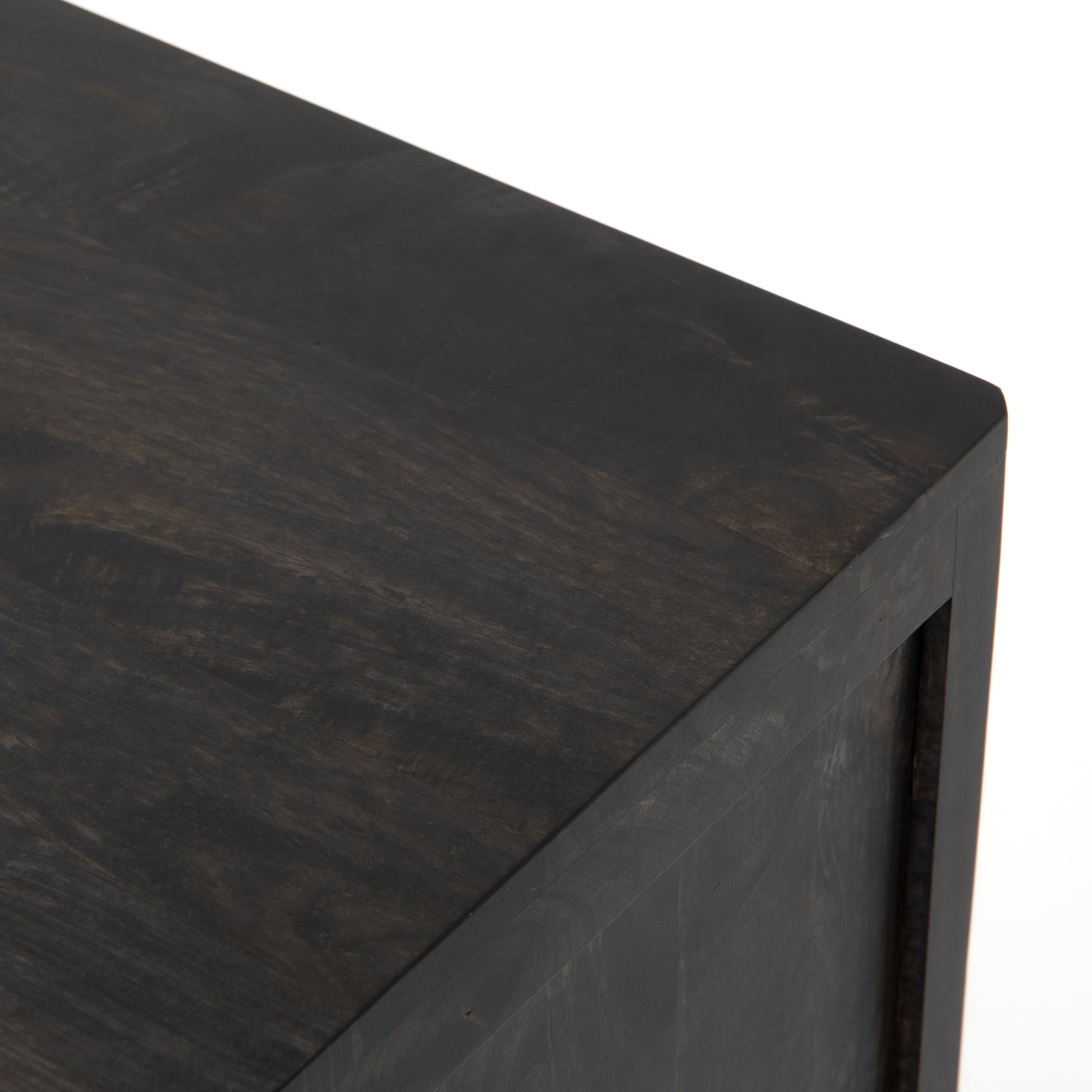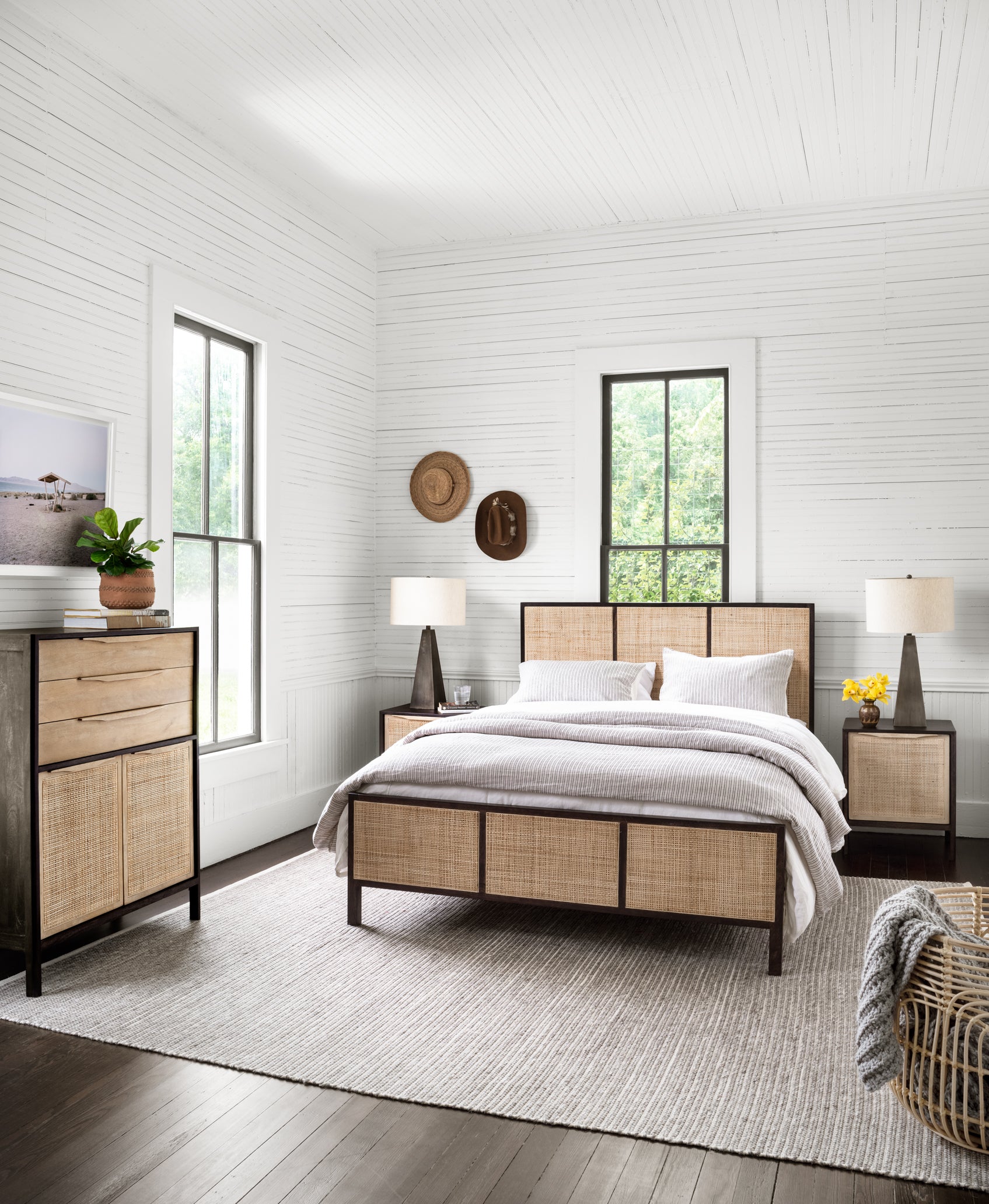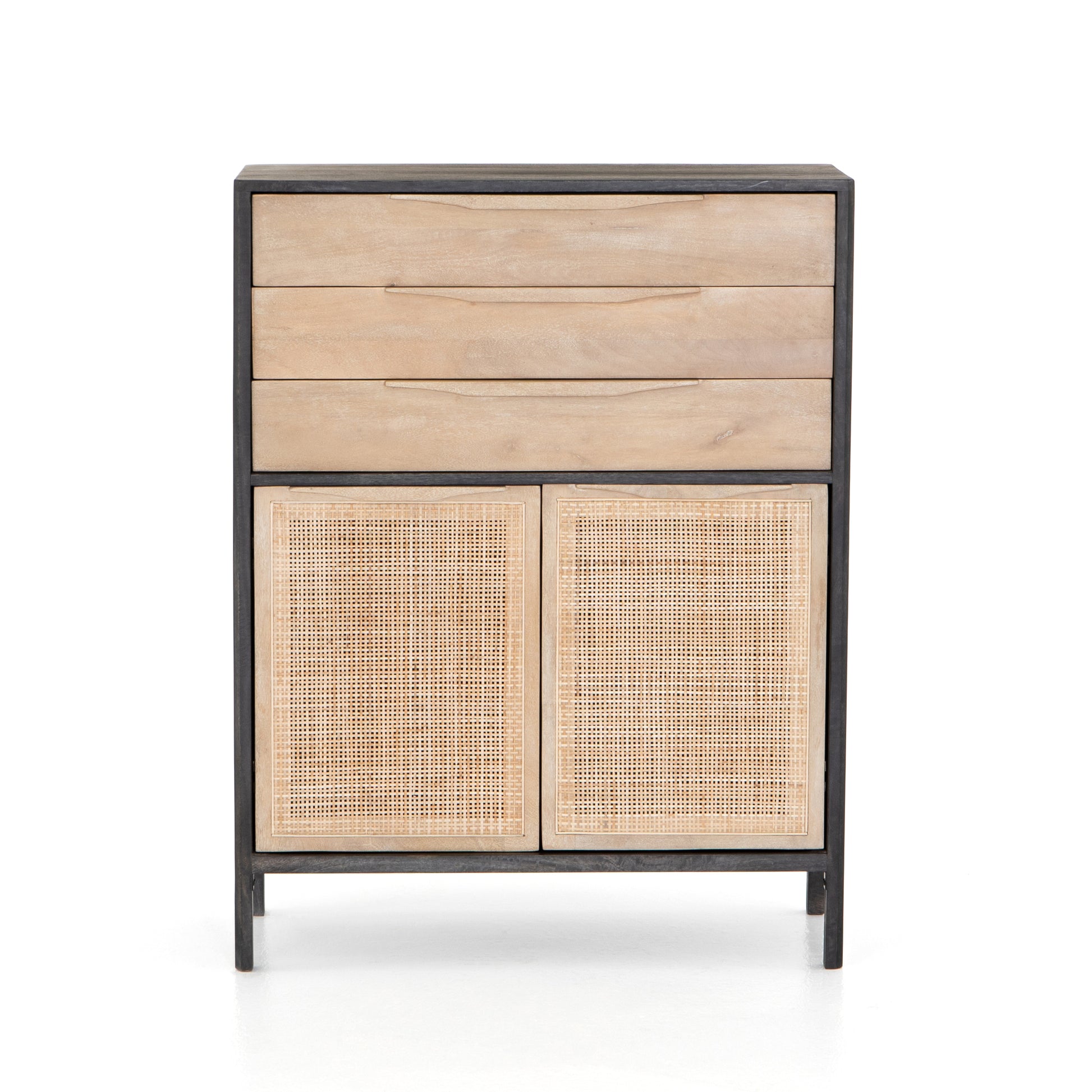 Natural mango framing features front cabinetry of woven cane, for a textural look with eye-catching contrast. A top trio of drawers and lower cabinetry bring plenty of storage space to the bedroom.