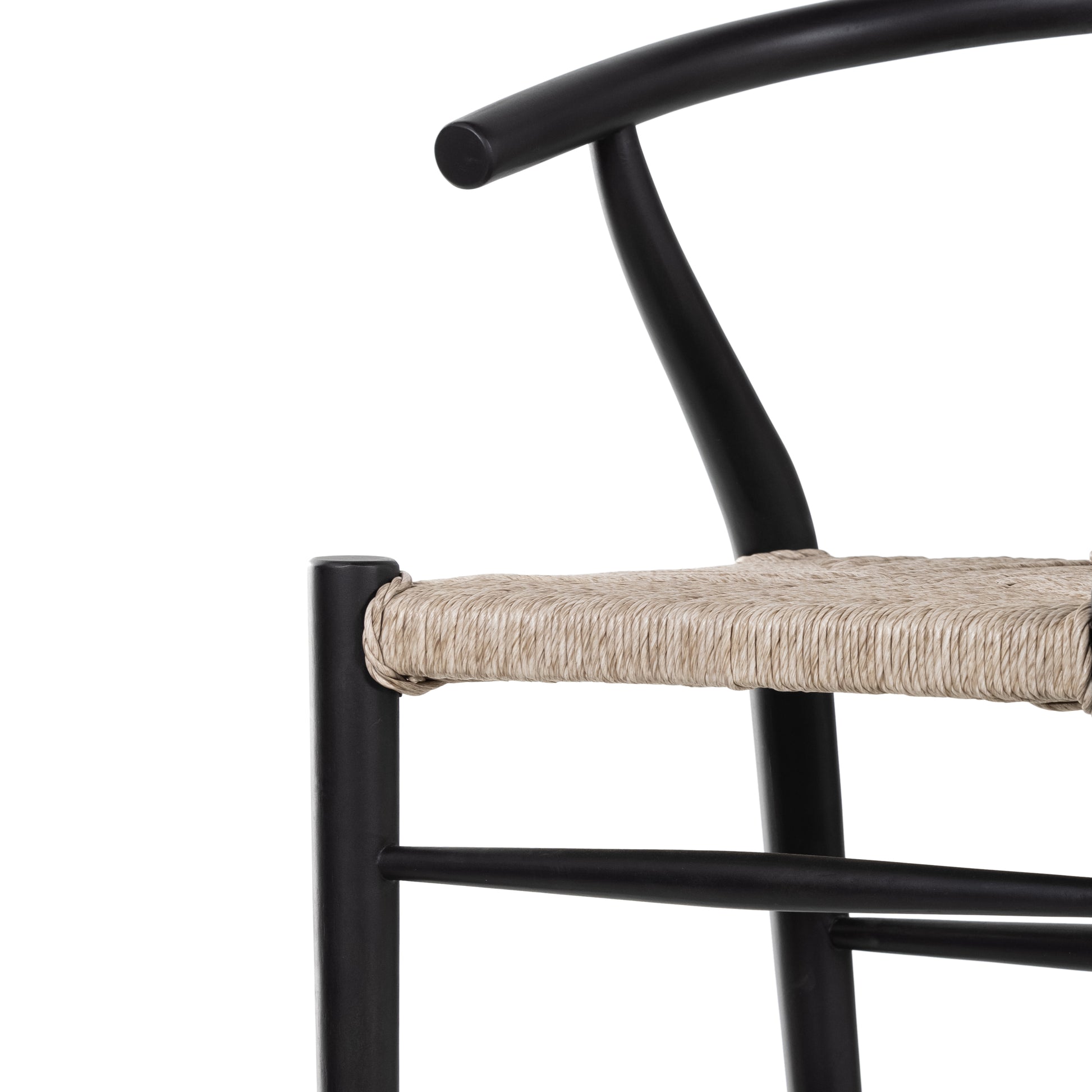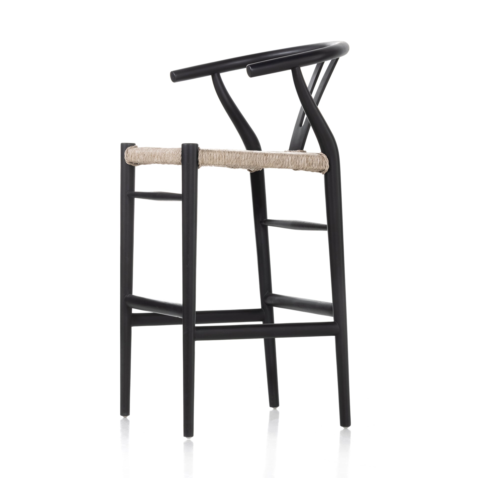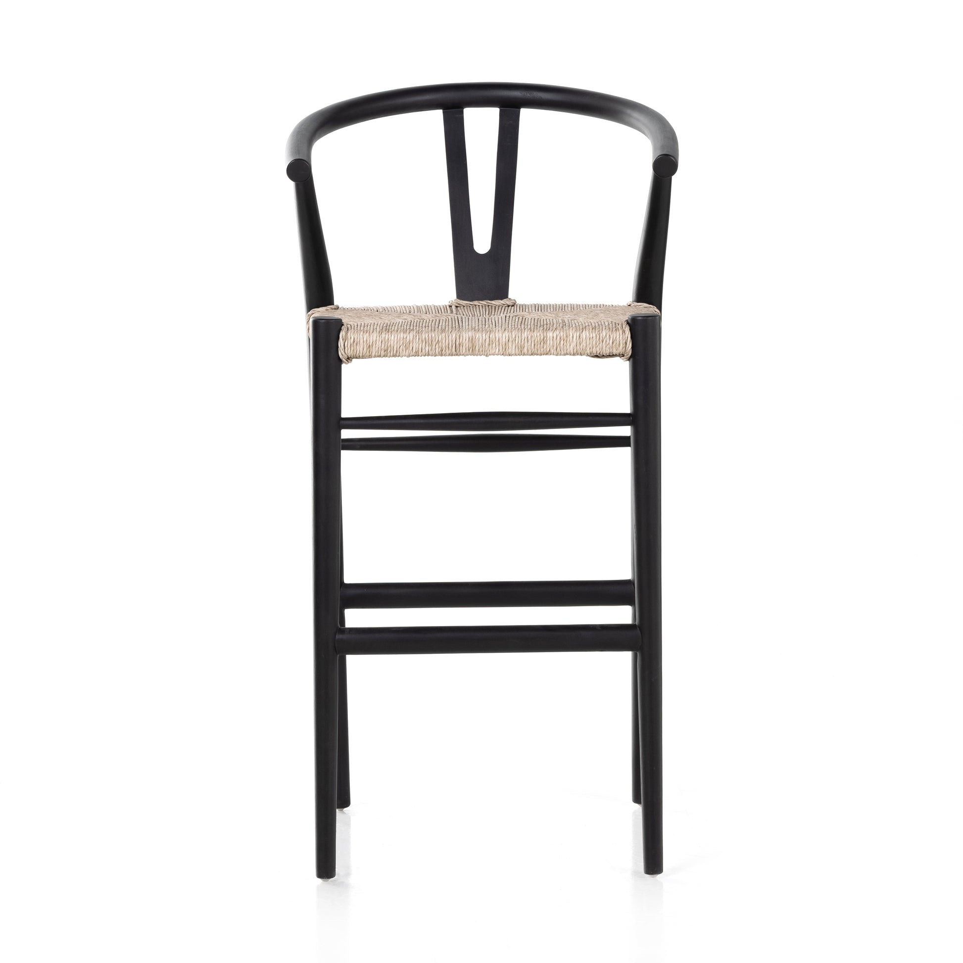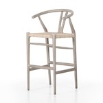 Modern curves redefine the classic wishbone-style bar stool. Vintage white all-weather wicker is woven for texture and contrast against black teak framing. For indoor use only. 42"H.