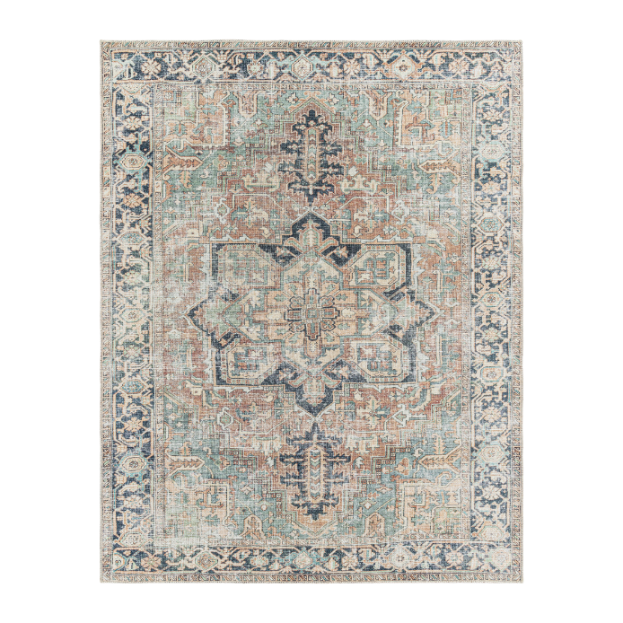 - Colors: Seafoam, Brick Red, Navy, Saffron, Pale Blue, Orange, Tan