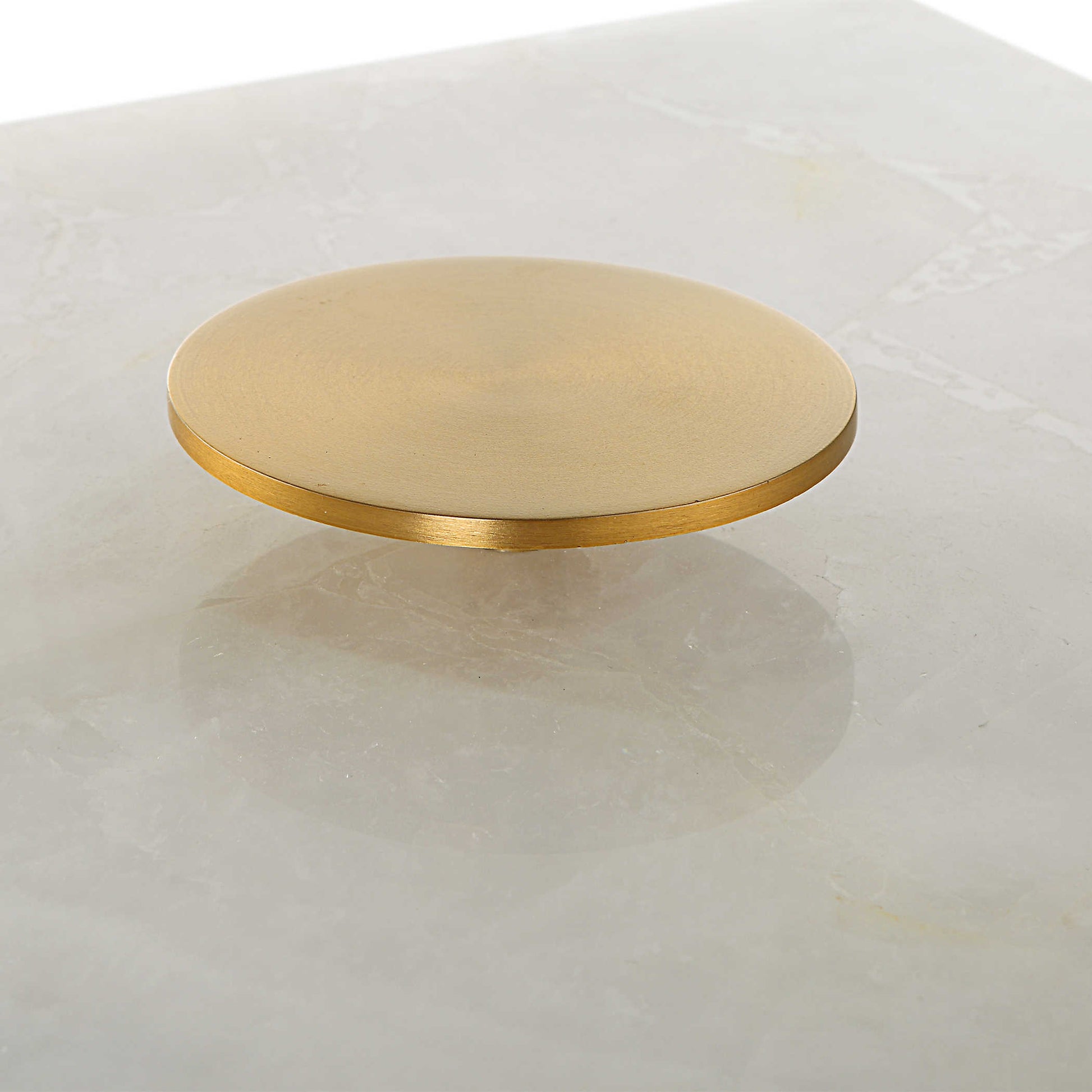The perfect place to stow remotes. This beautiful metal box is finished in satin brass, and the top is a combination of crystal stone, quartz and polymer. The interior is finished in a white velvet lining, allowing more delicate items to be protected.