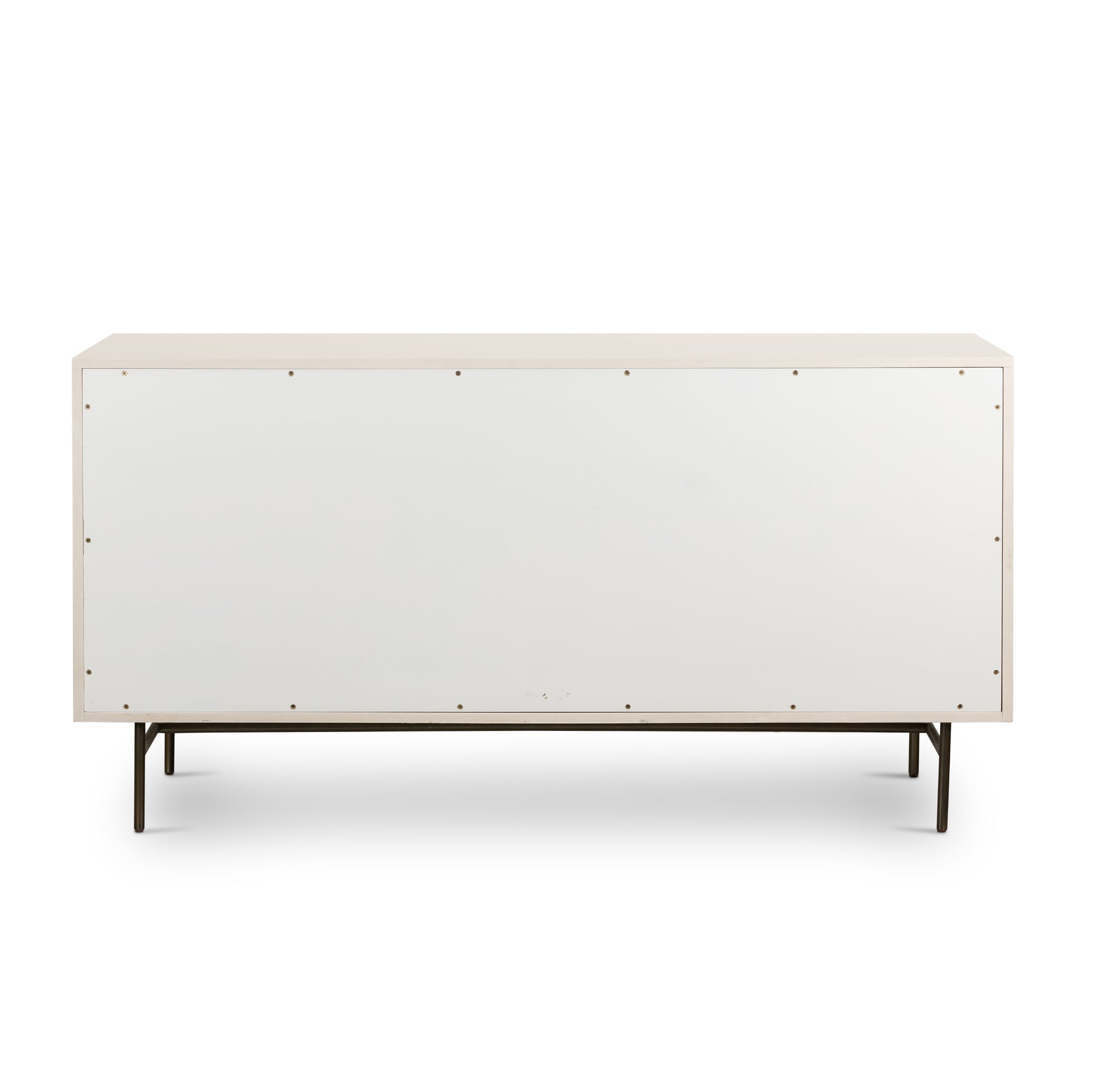 Bring a light look to bedroom styling. A lacquered six-drawer dresser features woven cane panels and half-moon hardware finished in an aged brass.
