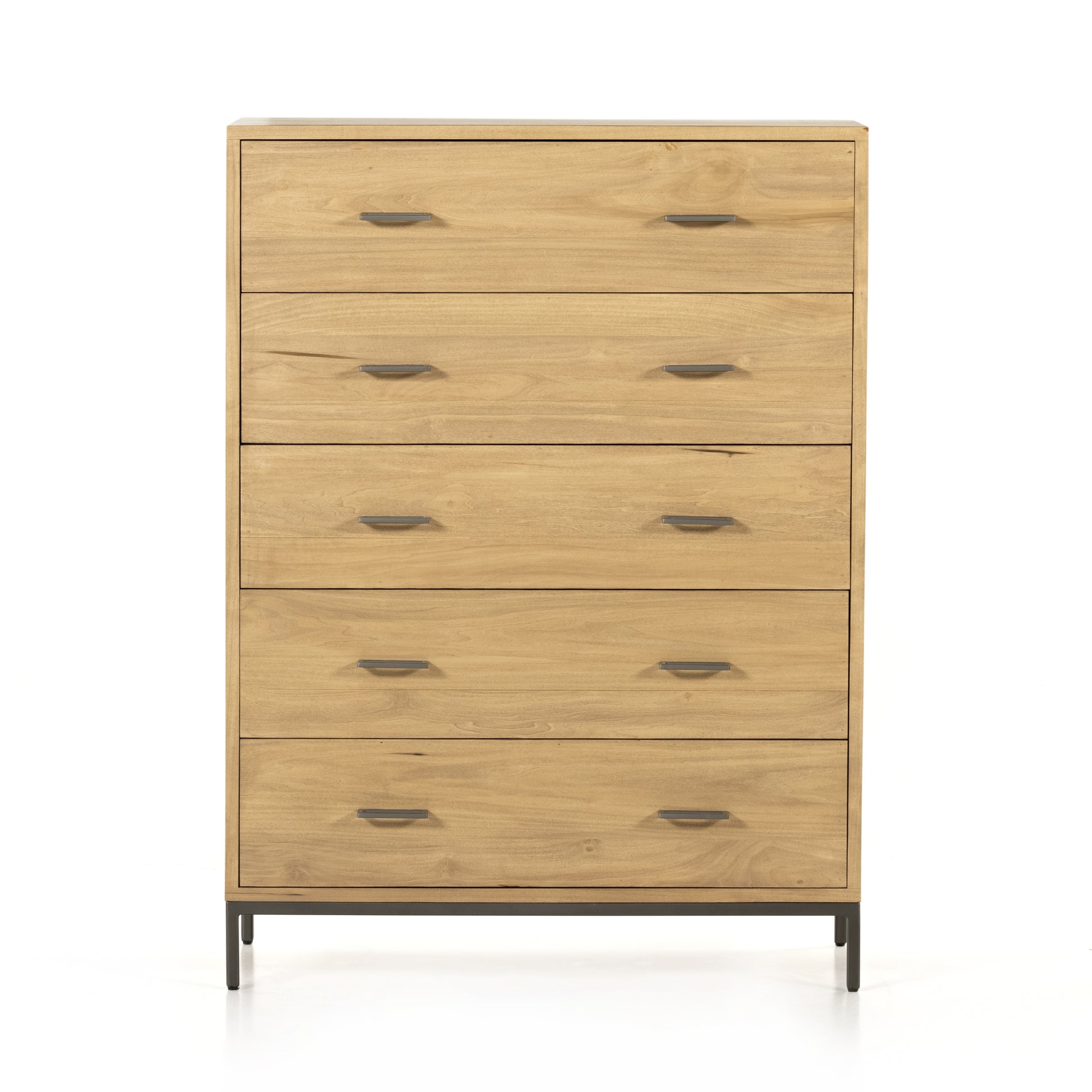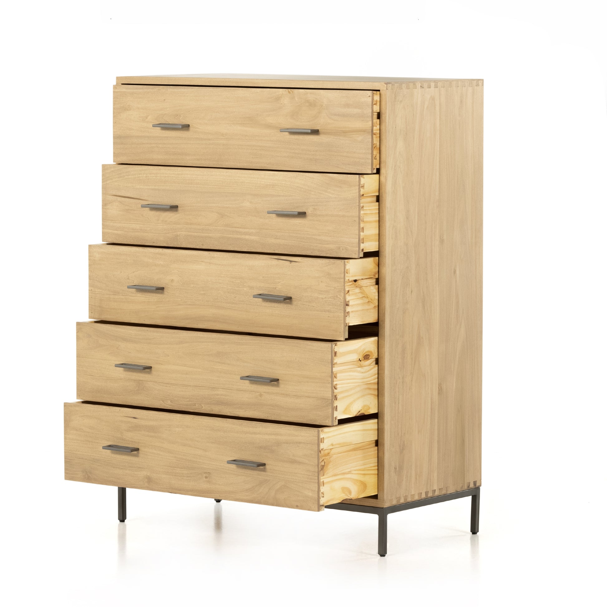 Solid poplar in a soft, natural hue creates a linear silhouette for five spacious drawers with iron hardware