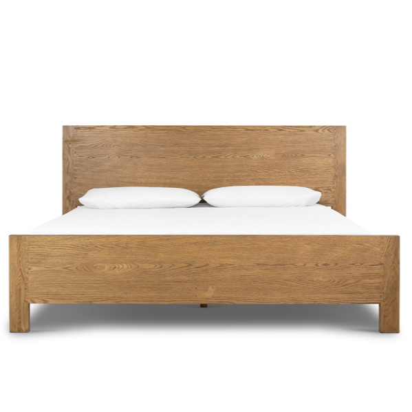A simply shaped bed of warm-finished oak offers a handcrafted look inspired by midcentury design.