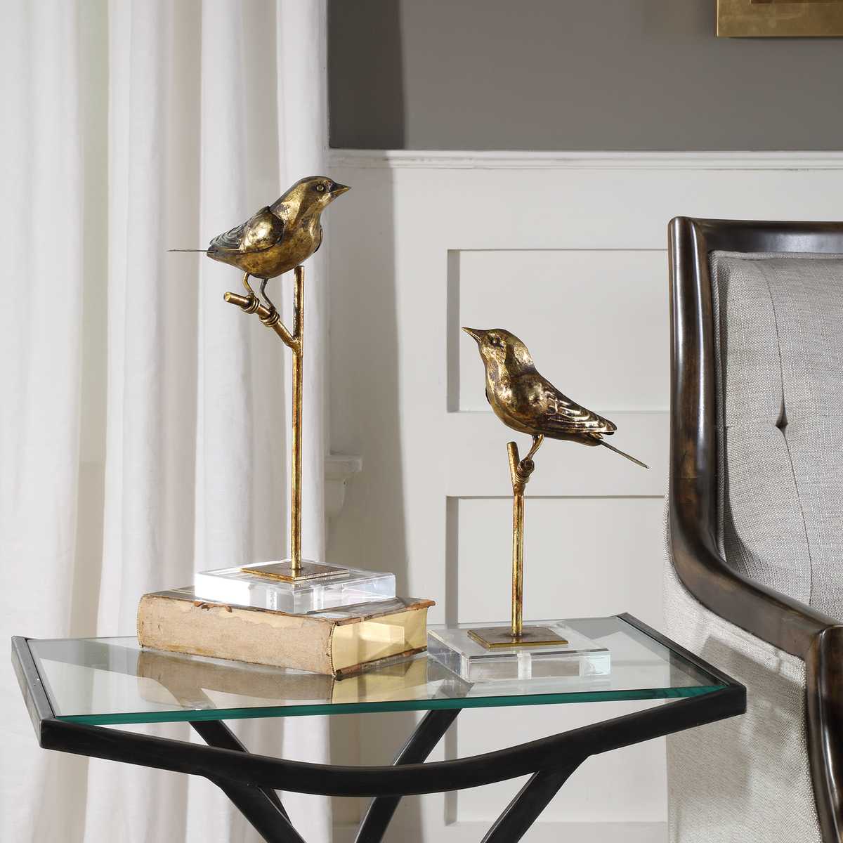 Antiqued, gold leaf perched bird figurines displayed on crystal bases. Sizes: S-6x10x5, L-7x13x6