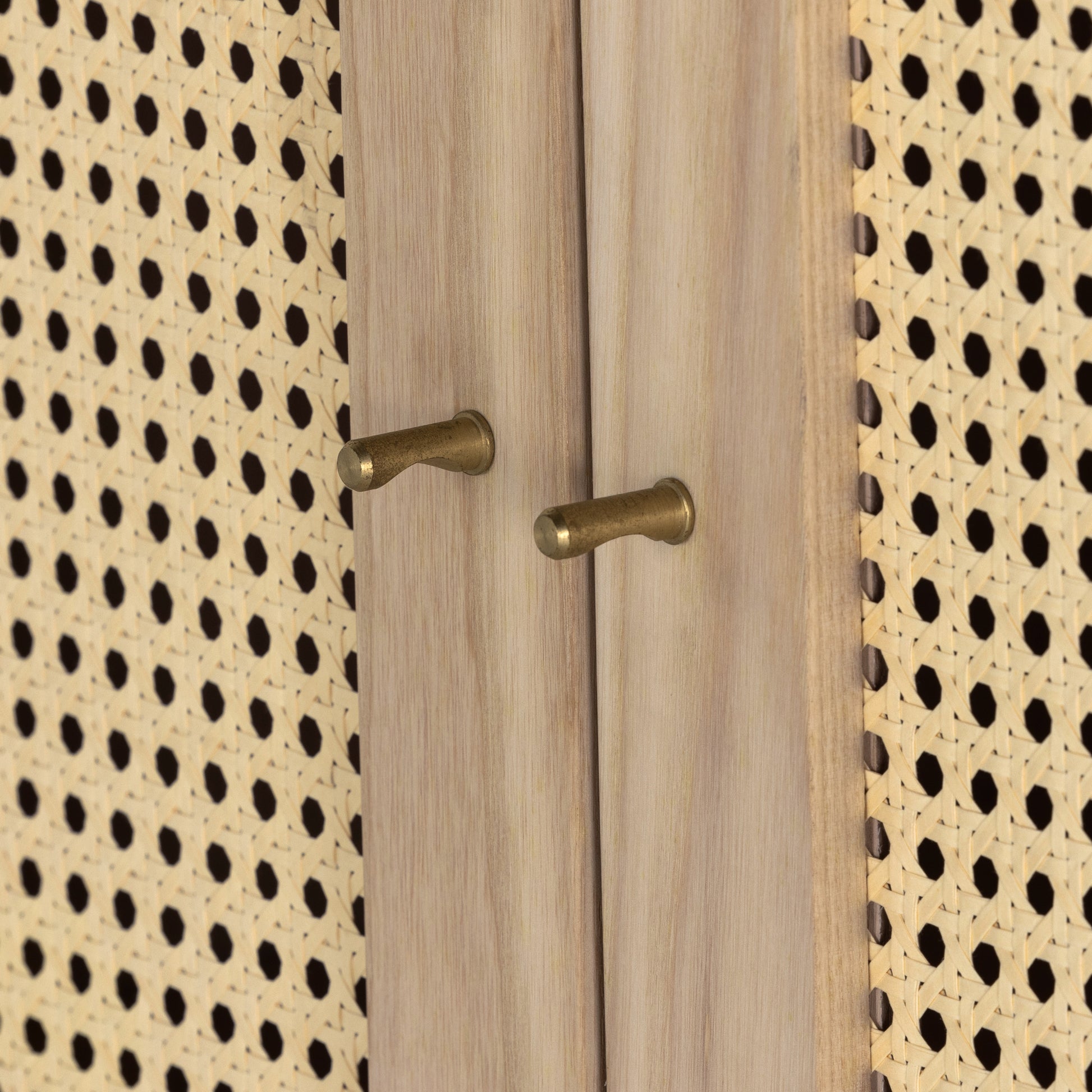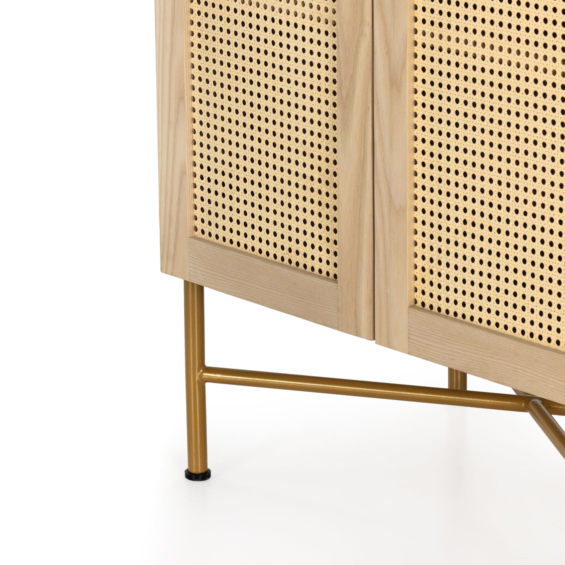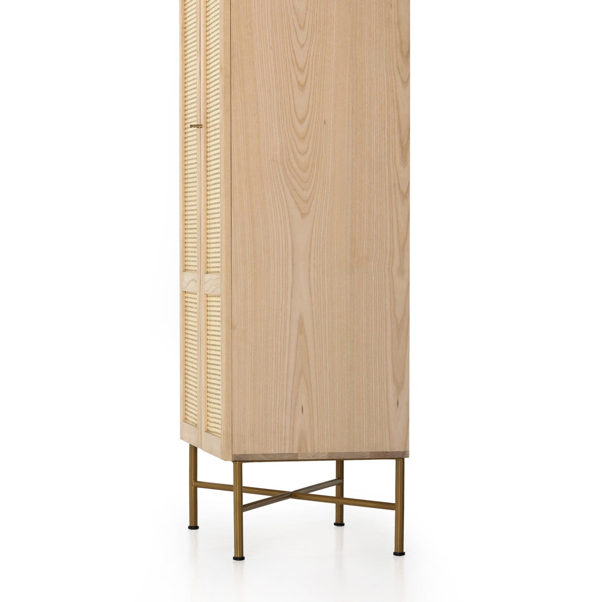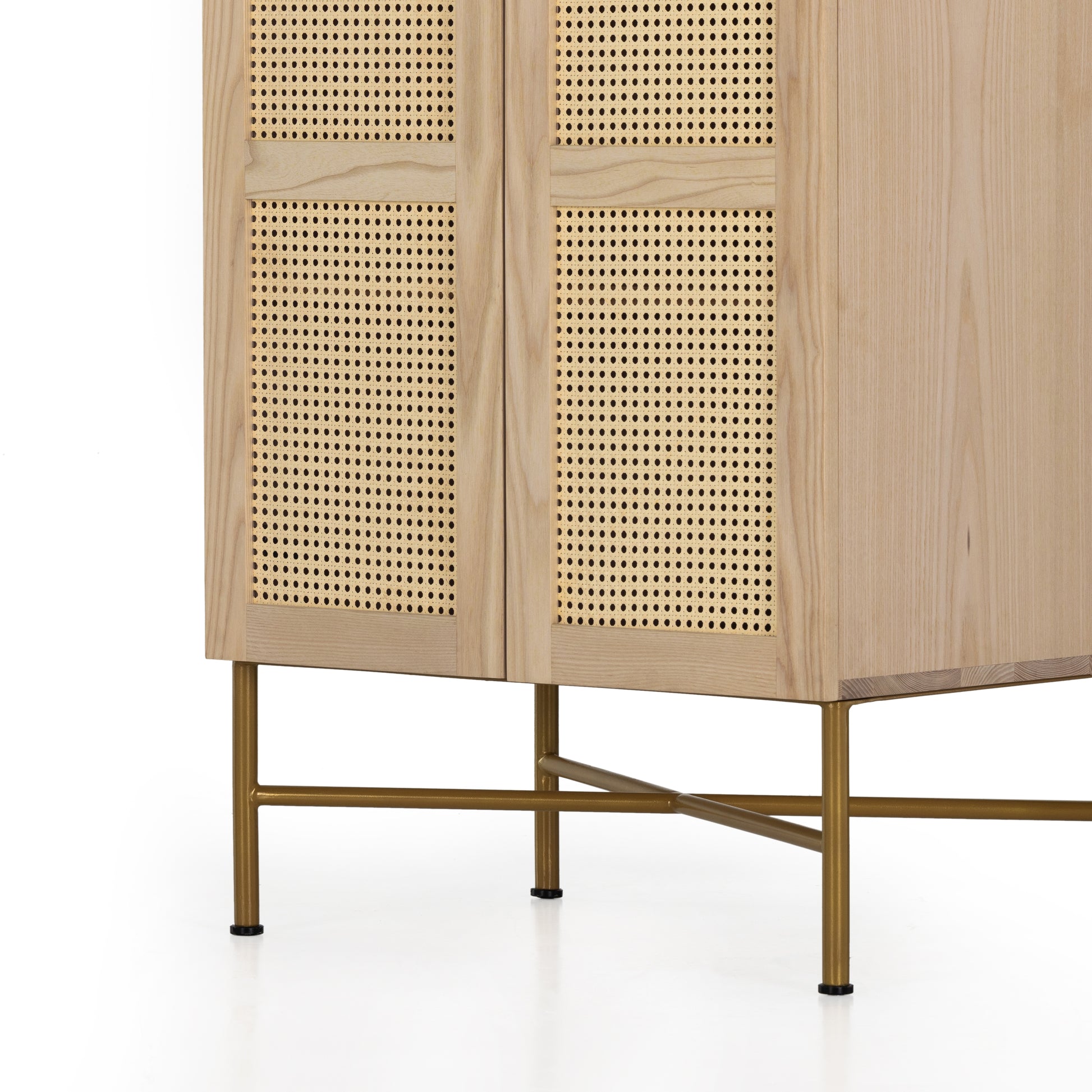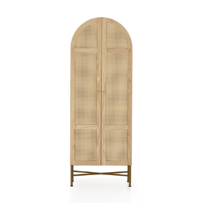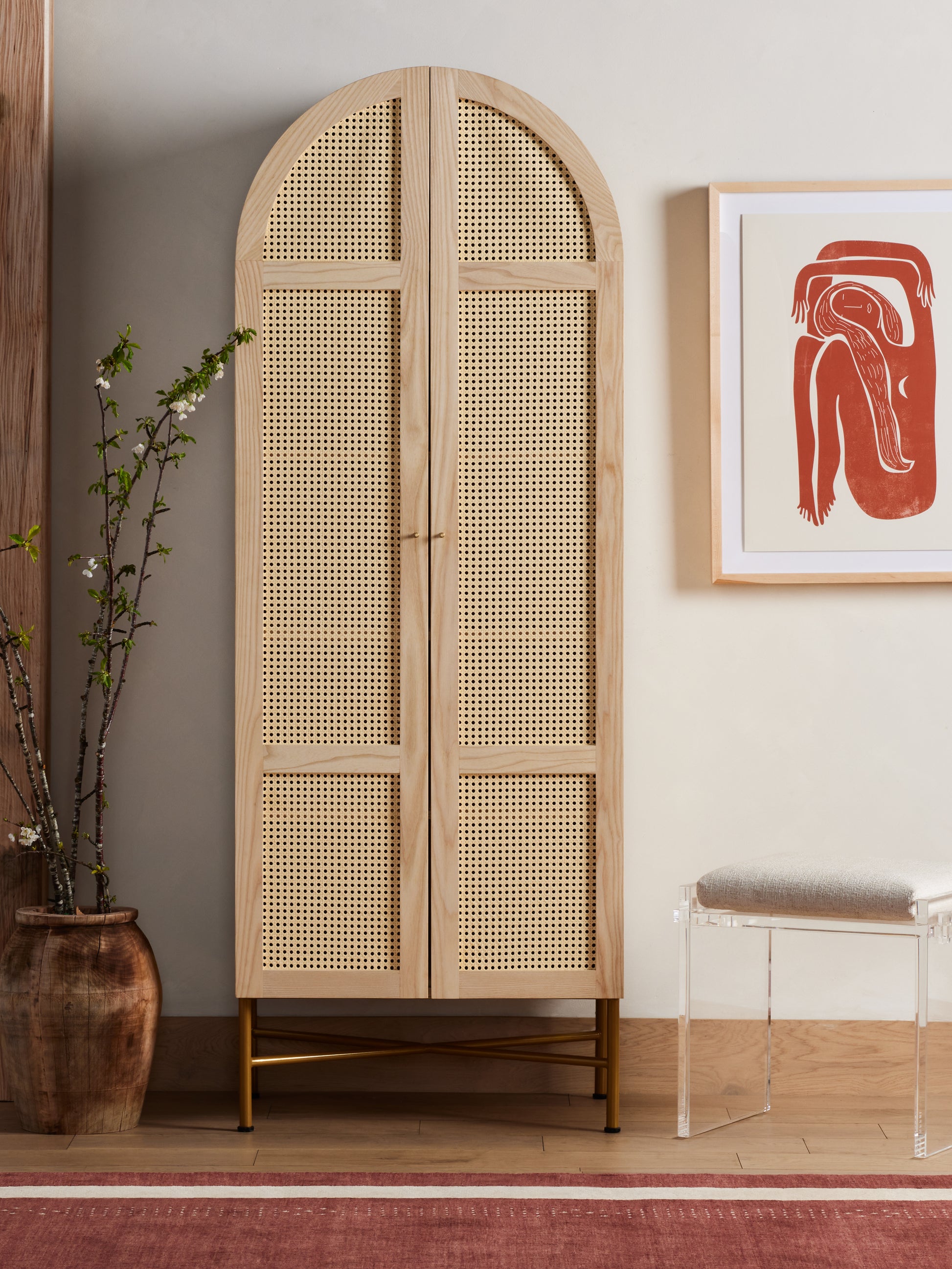 Material matters. Natural ash veneer forms a beautifully shaped arch, welcoming inset cane paneling for on-trend texture. An airy base of gold-brushed iron keeps things looking light, while ample adjustable interior shelving awaits storage of everything from books, clothing, serveware, and more.