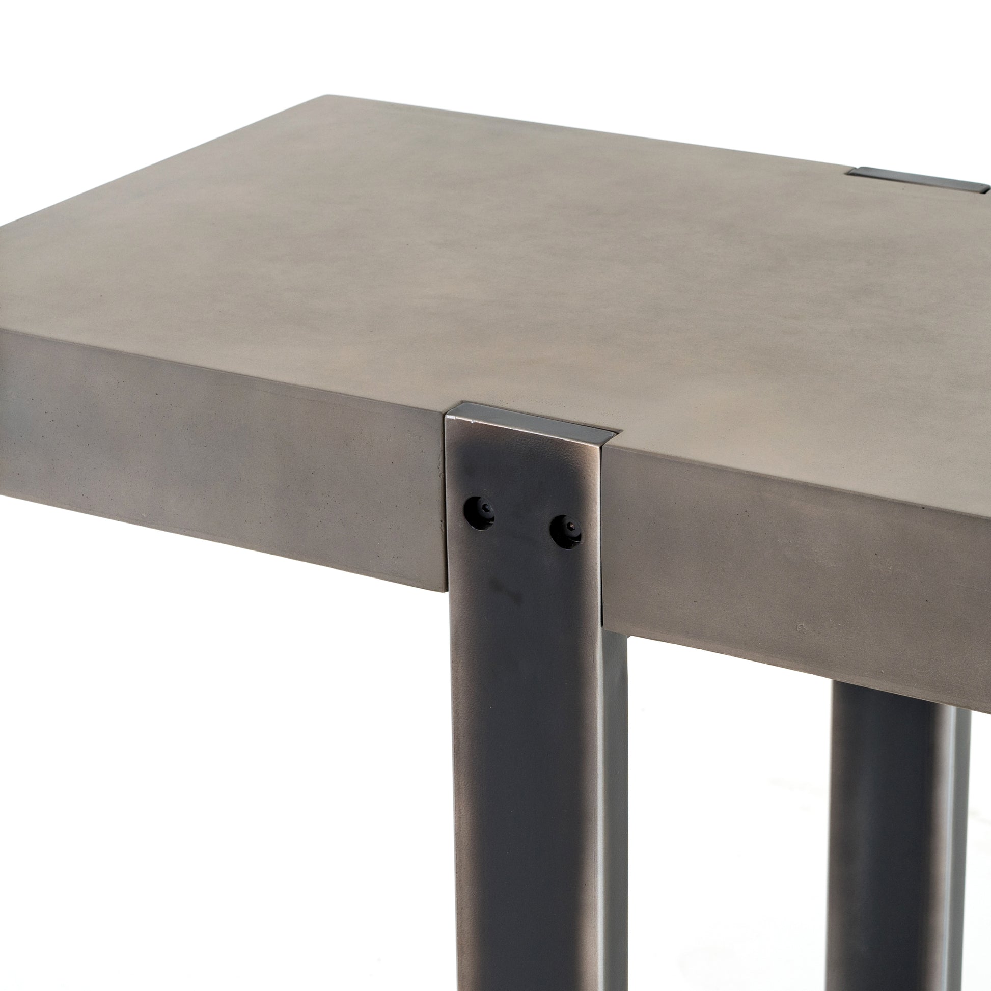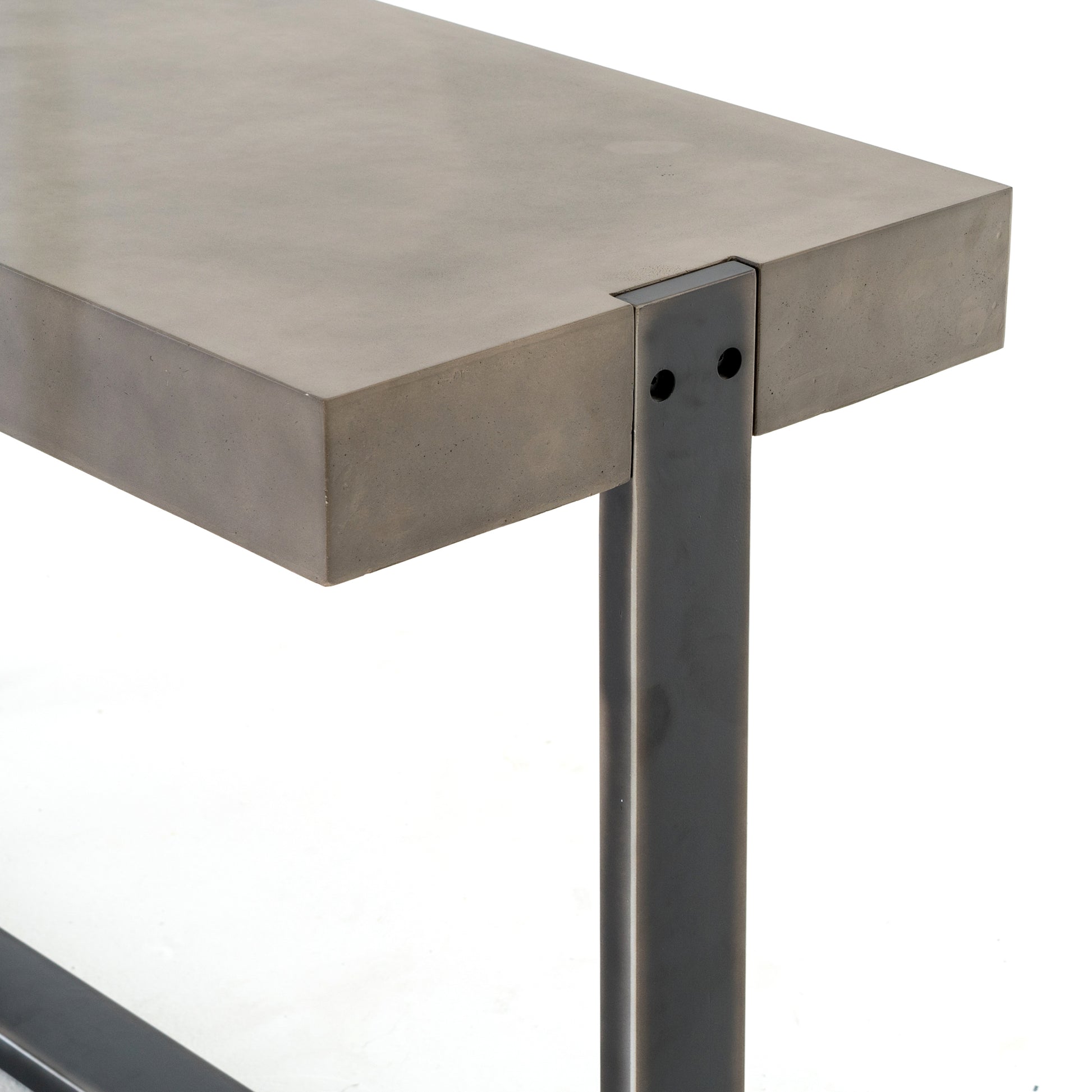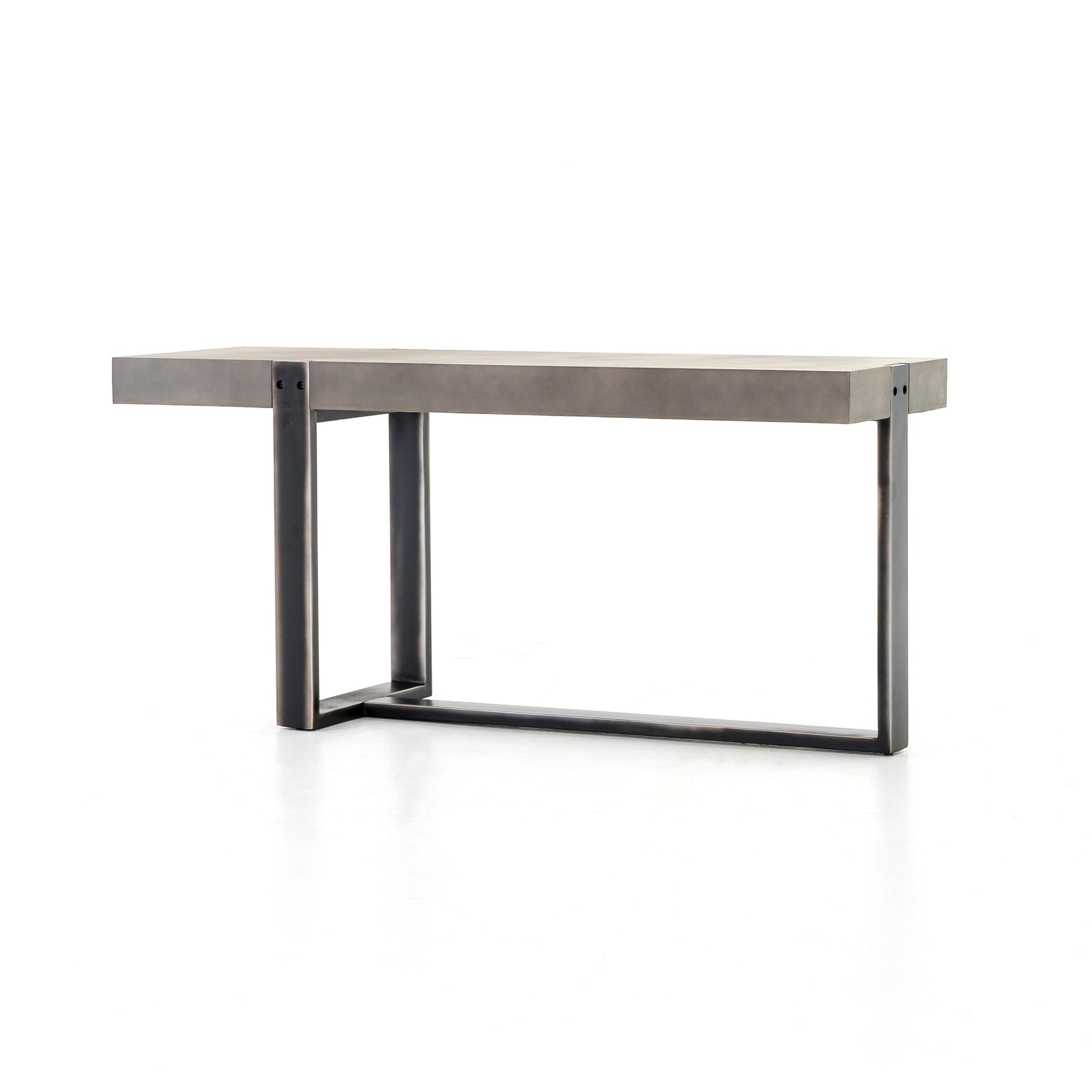 Set on an intriguing dark iron base, this console table’s grey concrete top features rubbed edges and industrial rivets. Its modern mix of materials and streamlined shape sits well with a variety of décor styles.