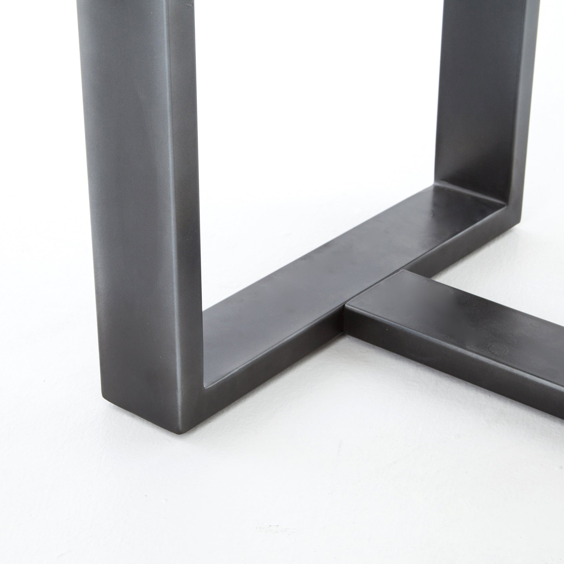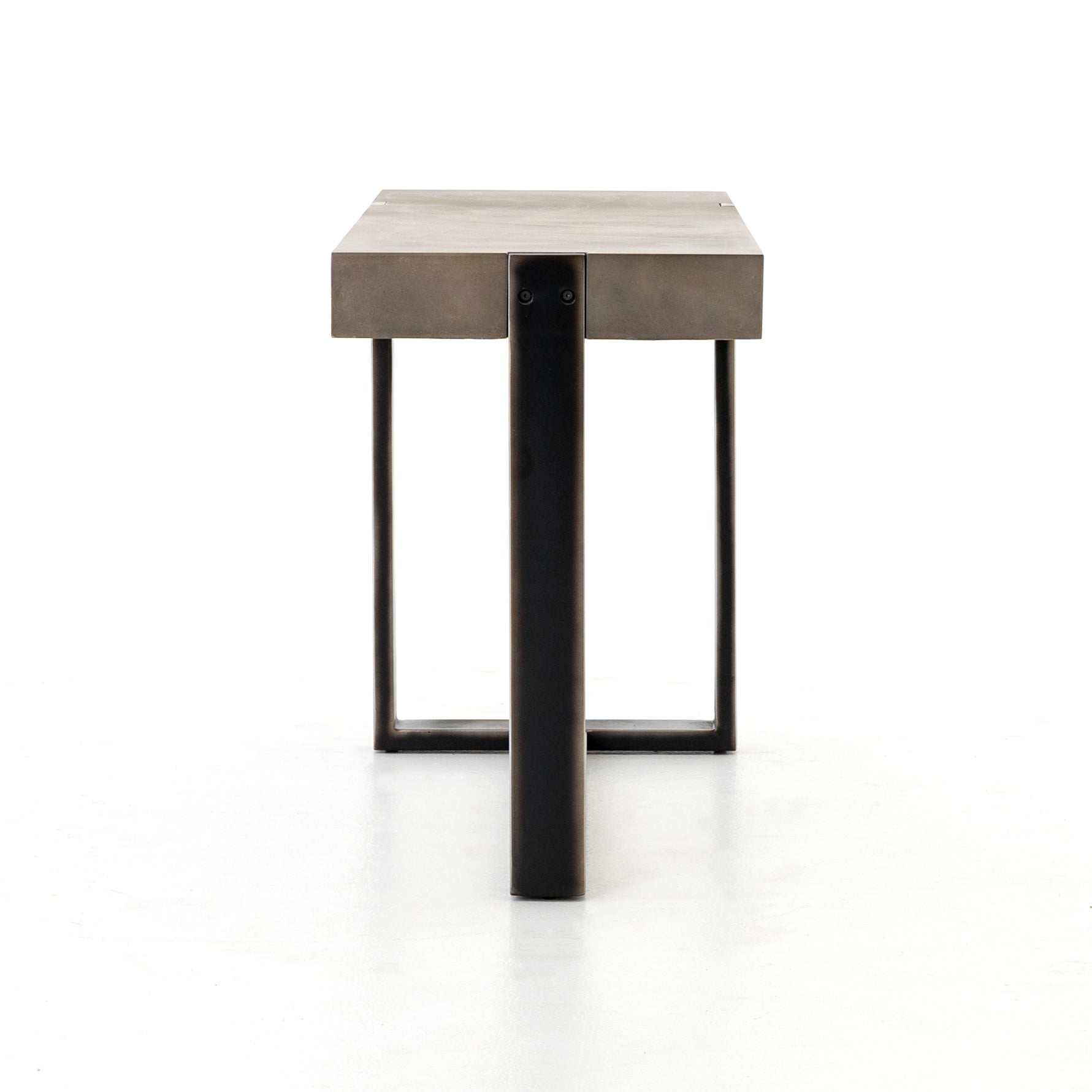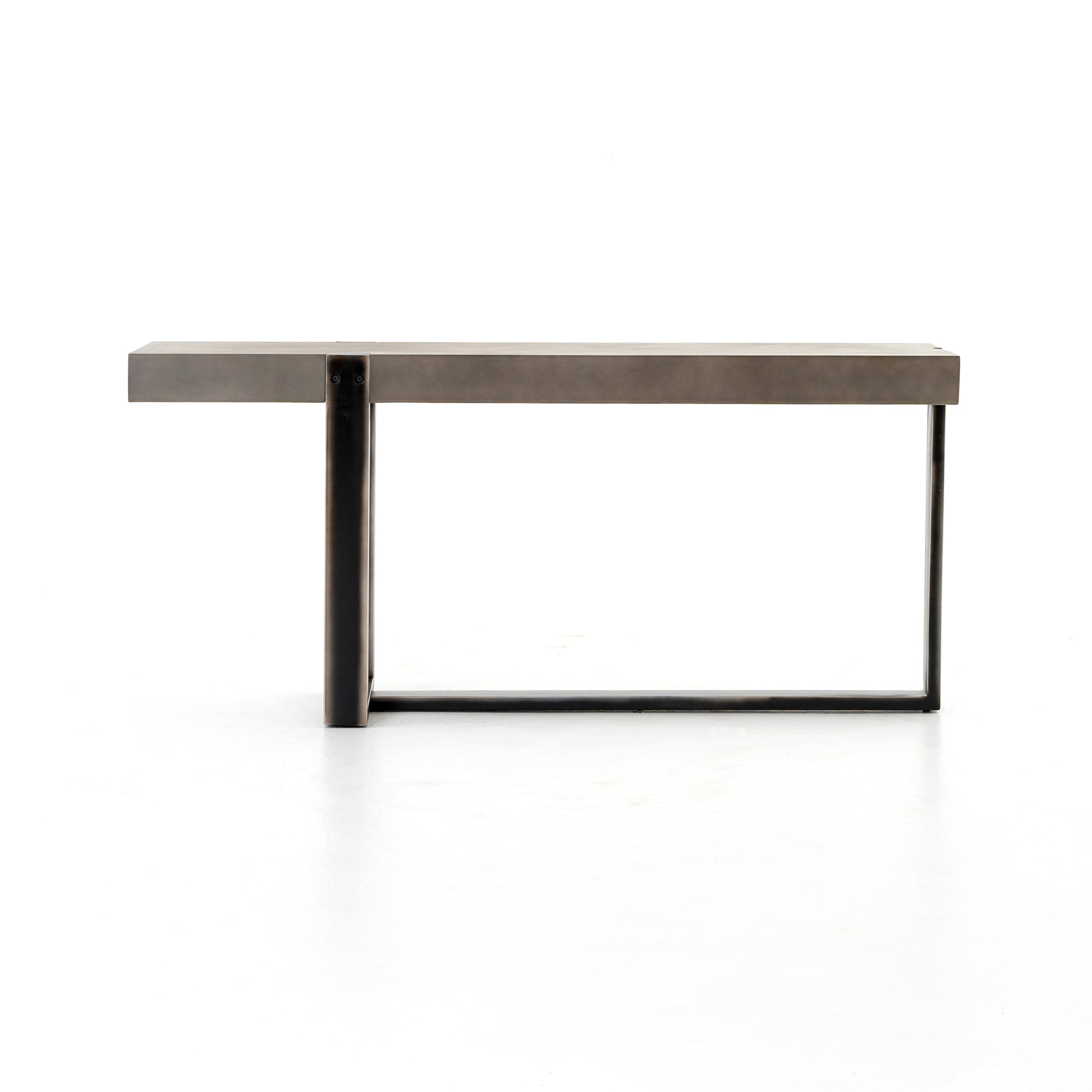 Set on an intriguing dark iron base, this console table’s grey concrete top features rubbed edges and industrial rivets. Its modern mix of materials and streamlined shape sits well with a variety of décor styles.