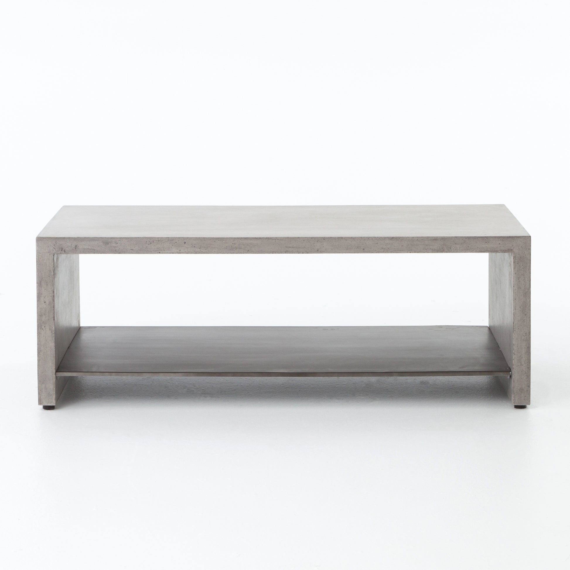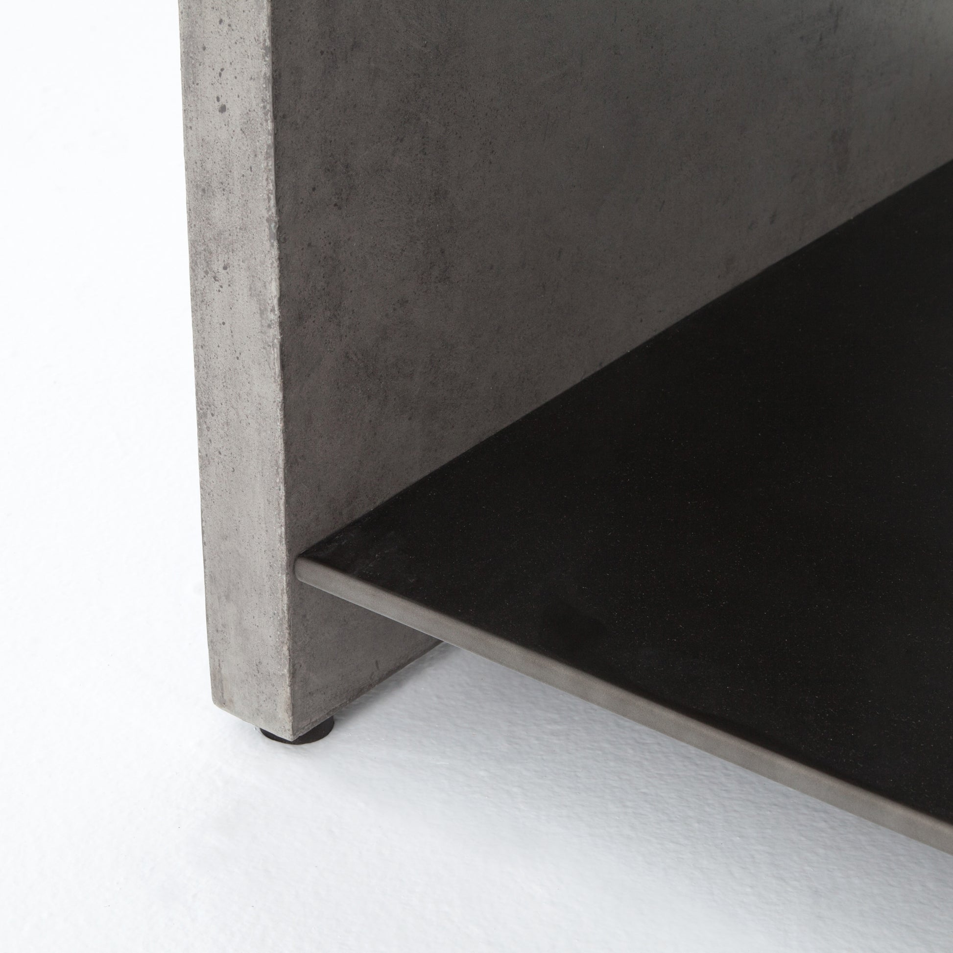 Traditionally outdoor materials are updated for indoor use. A black metal shelf seems to float between a minimalist concrete frame in dark grey, for a sleek, industrial-inspired look.