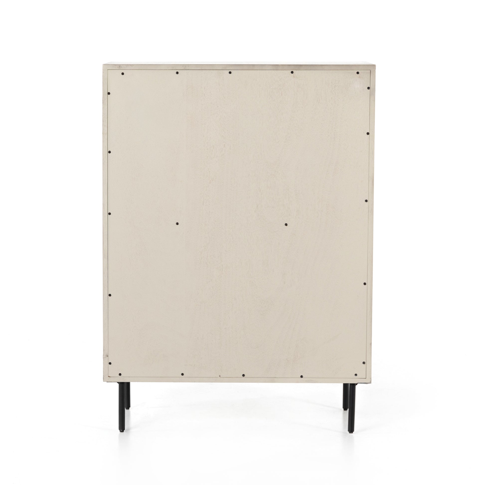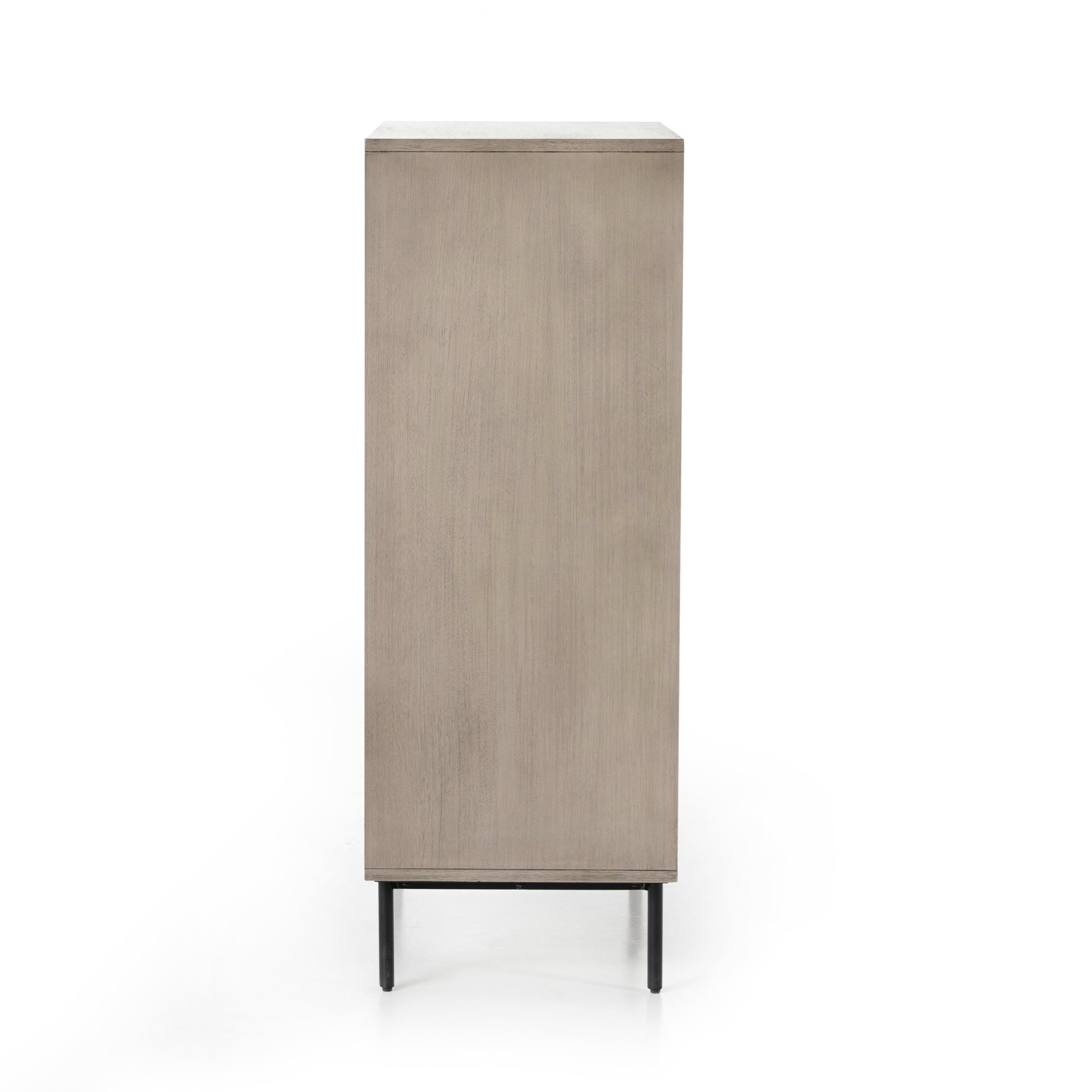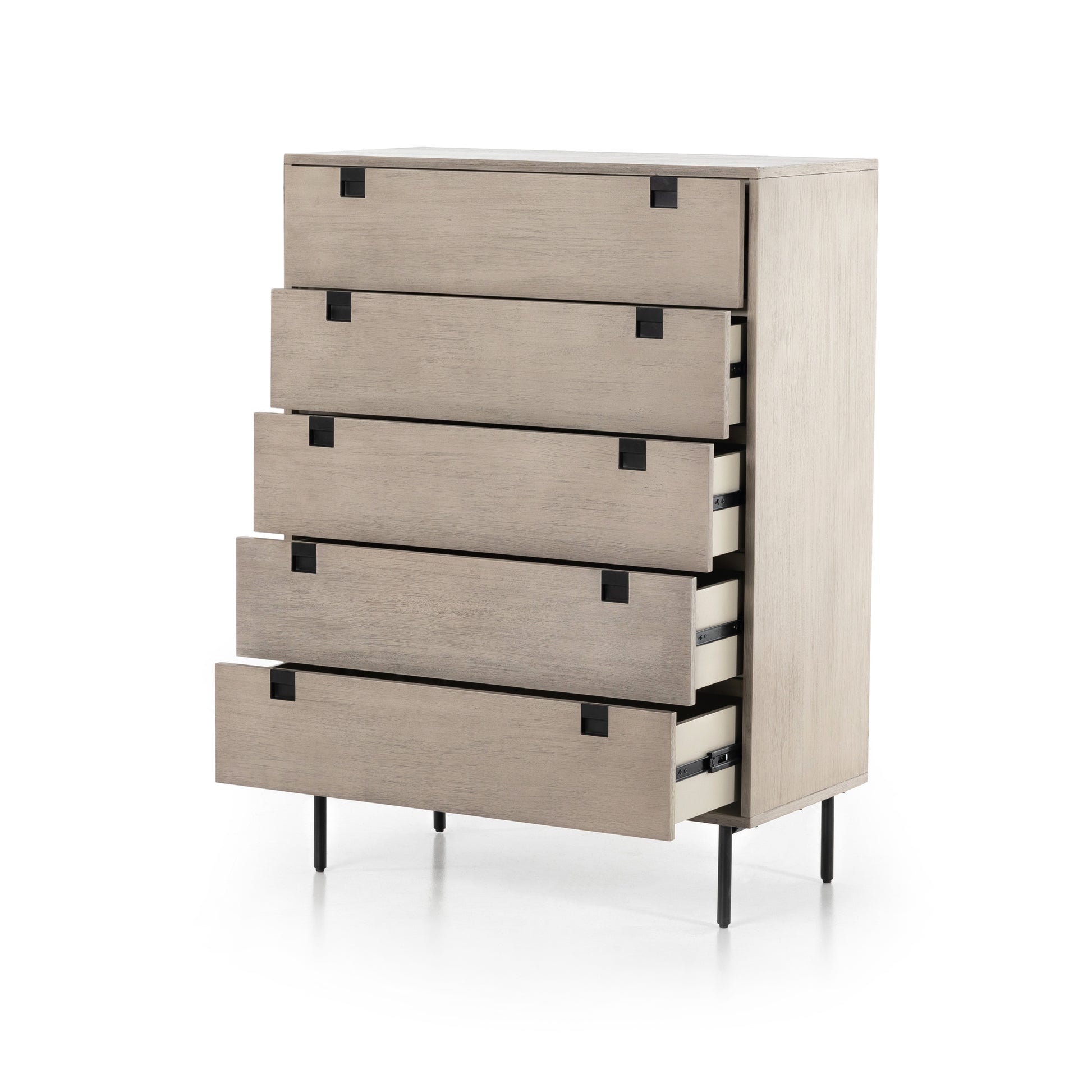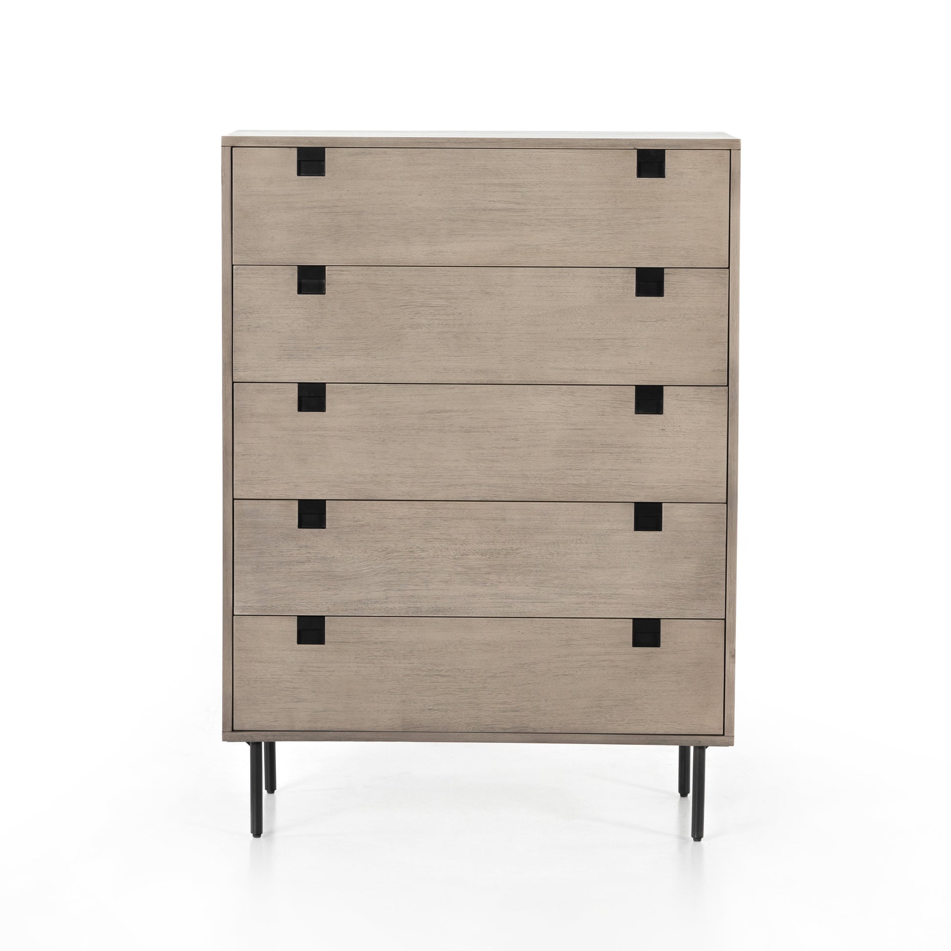 Clean, streamlined shaping brings a structured-yet-light look to bedroom storage, with five spacious drawers of grey-washed acacia veneer perched atop iron legs finished in an antique bronze.