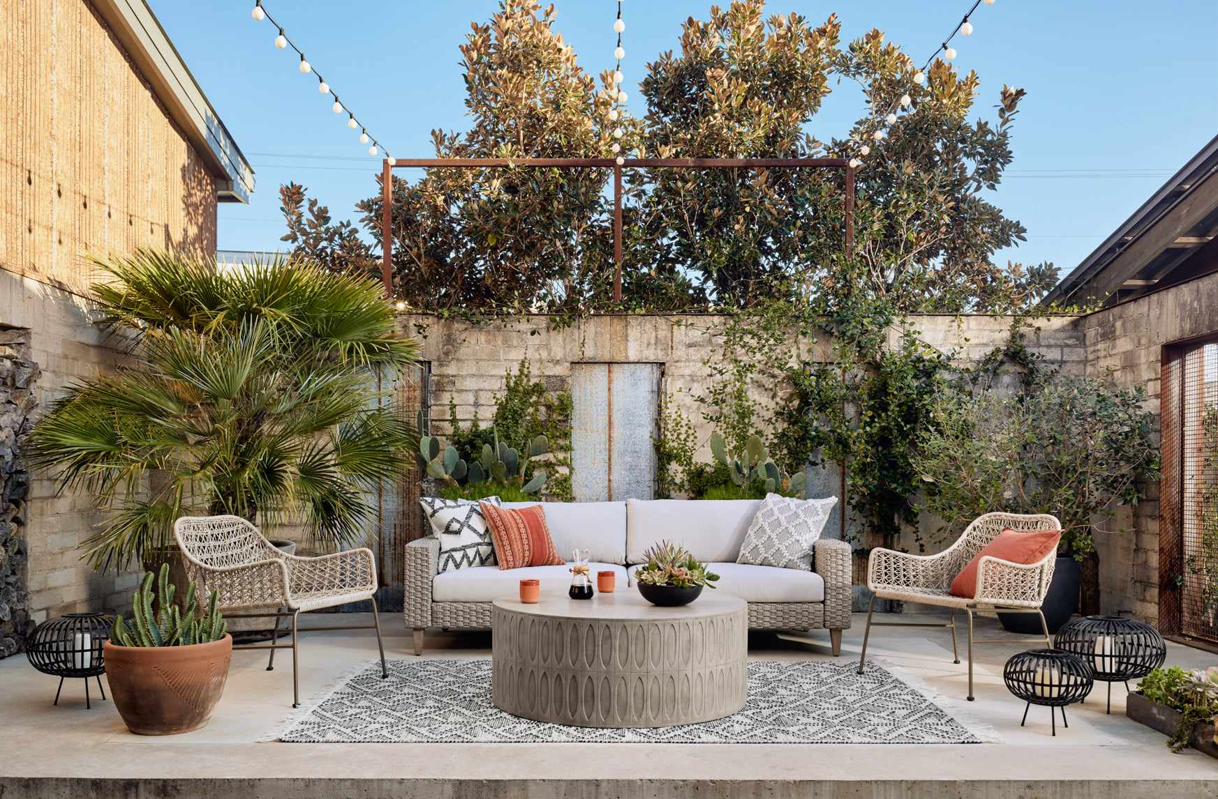 Concrete adopts alluring shapes as modern geometrics play with nature's petal form. A hollowed drum of dark grey concrete is intricately etched for artistic intrigue. Safe indoors or out. Cover or store indoors during inclement weather or when not in use.